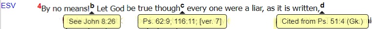 这些参考指示出经文或短语的引用来源,例如:“Cited from Ps. 51:4”(引自《诗篇》51:4)。在此例中,引用中包含了“Gk.”的缩写,表明在这种情况下,引用的出处是《七十士译本》(Septuagint),即旧约圣经的希腊文译本,新约作者常常引用它而不是希伯来文的旧约。