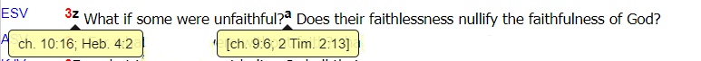 ESV(英文标准版圣经)的交叉参考系统包括多种类型的交叉参考,以下以《罗马书》3:3-4为例进行说明: