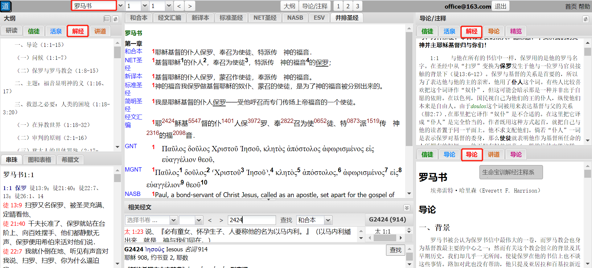 选择罗马书,并标签选择“解经”,即可阅读该注释的大纲、导论和注释。