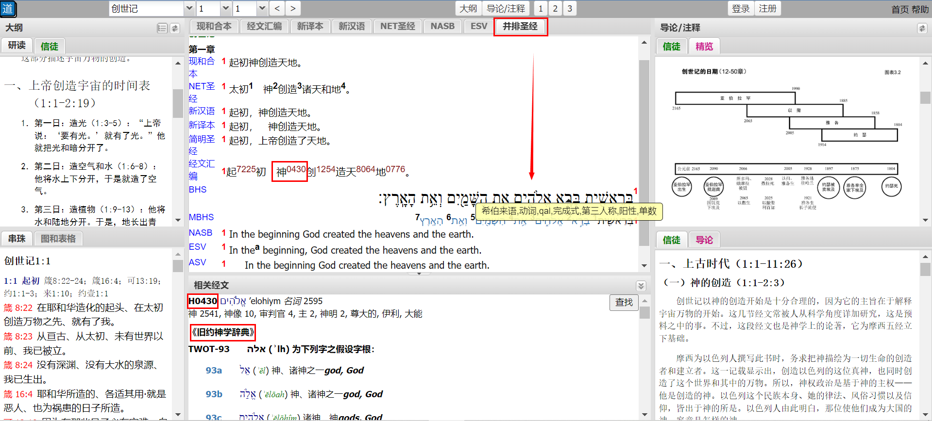 经文中带有 Strong 编号(H/G)的词汇可点击查看词义;通过 MBHS 可进一步查看对应词汇的词性及语法信息,并可联动查阅《旧约神学辞典》等工具书,帮助深入理解原文。