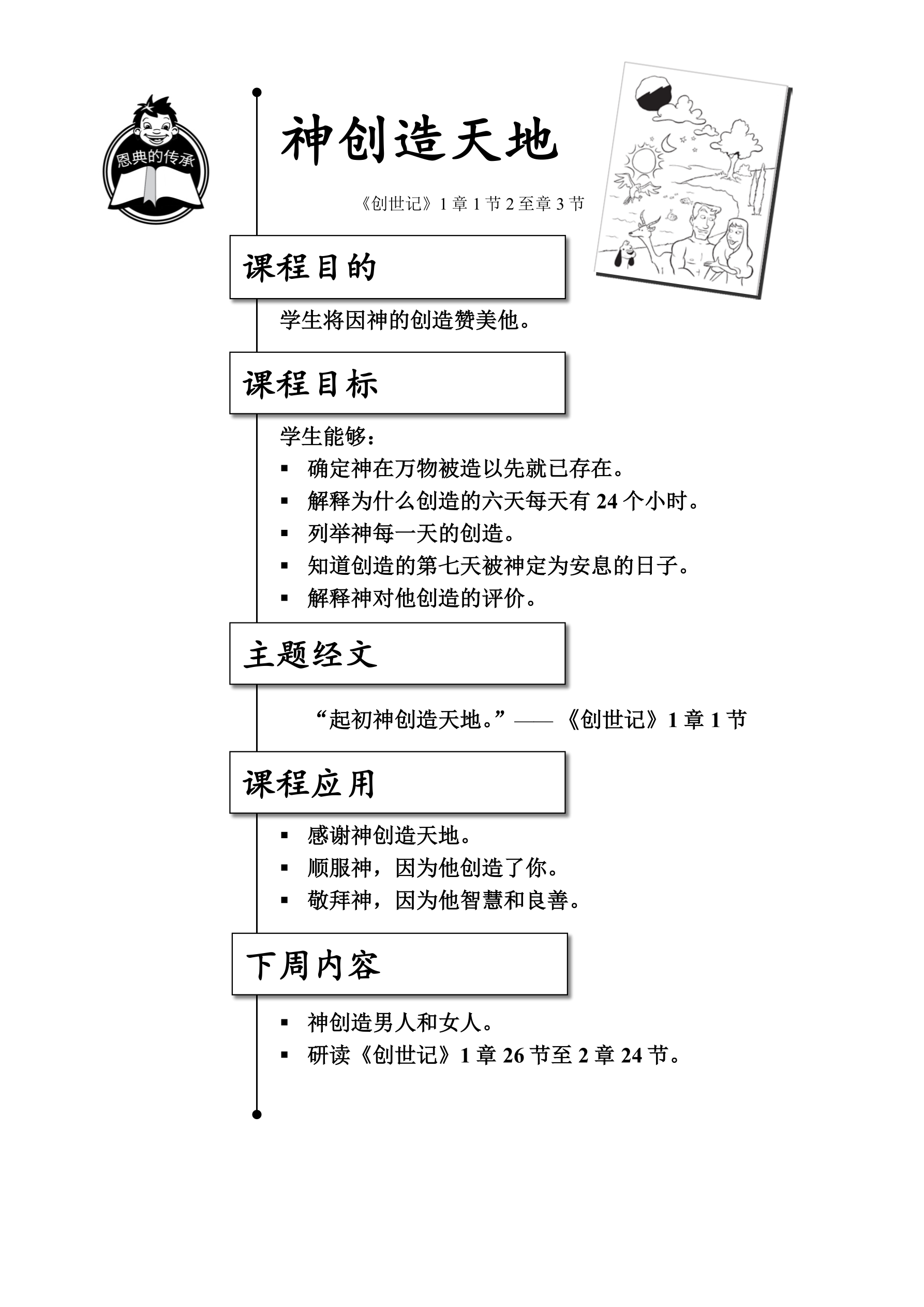 每课以一页概览开始,内容包括课程目的、课程目标/主要真理、主题经文以及课程应用。你可以用来指导一周的学习和备课。“课概览”部分旨在帮助你评估学生的学习内容。这一页是整节课的大纲。我们有意识地加入了比一般课程更多的目的/主要真理。随着时间的推移,您就能衡量出学生能消化多少内容。