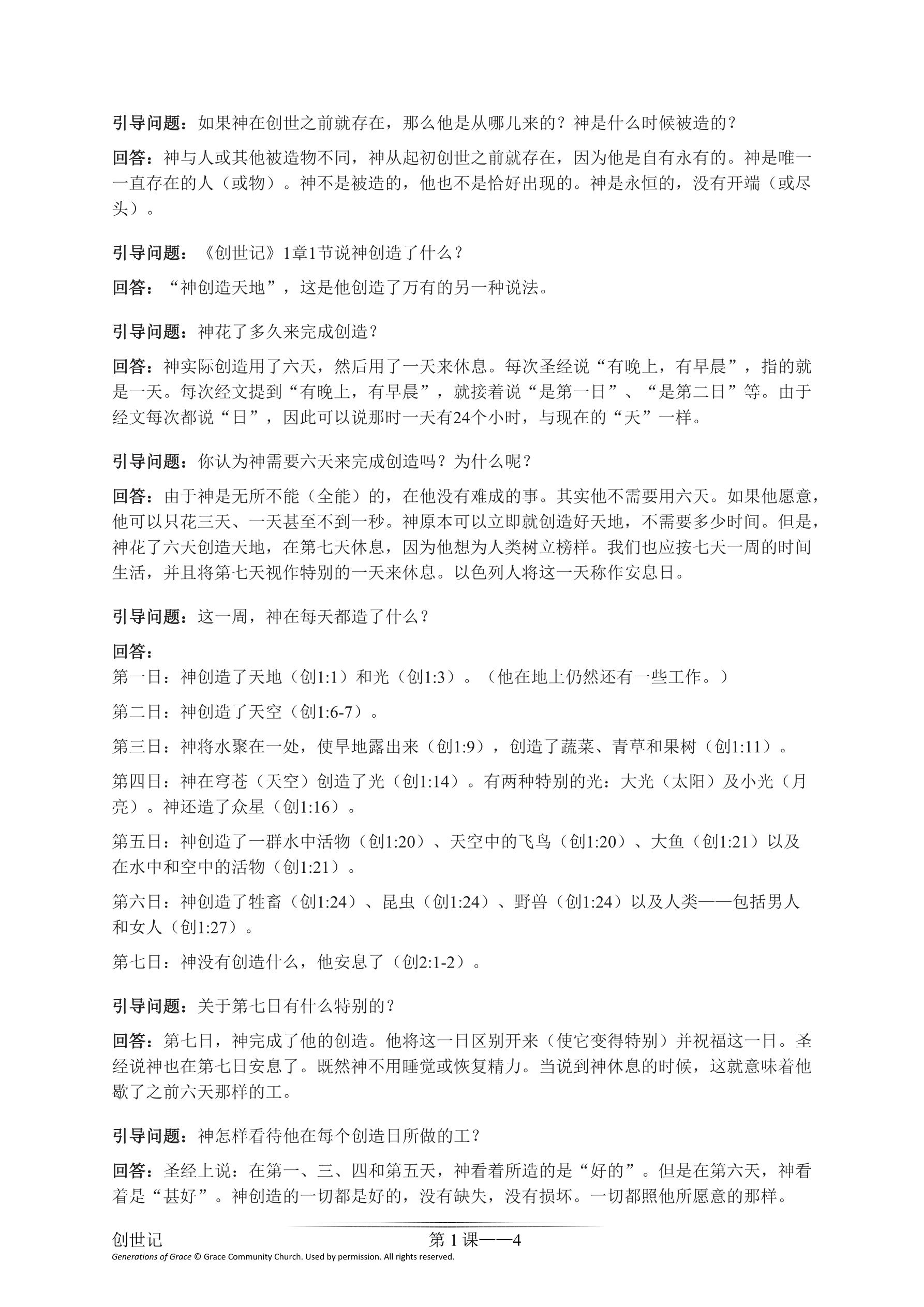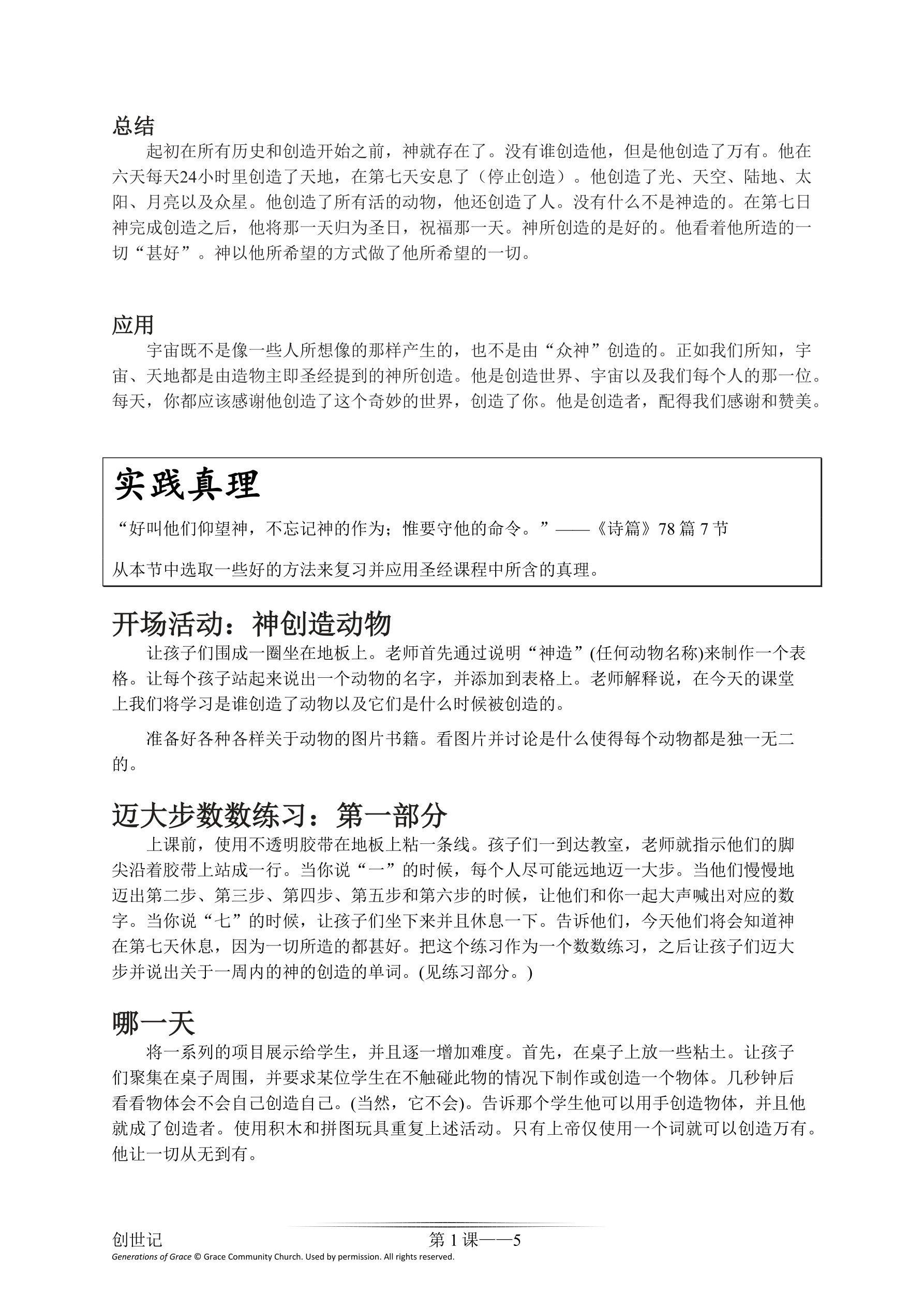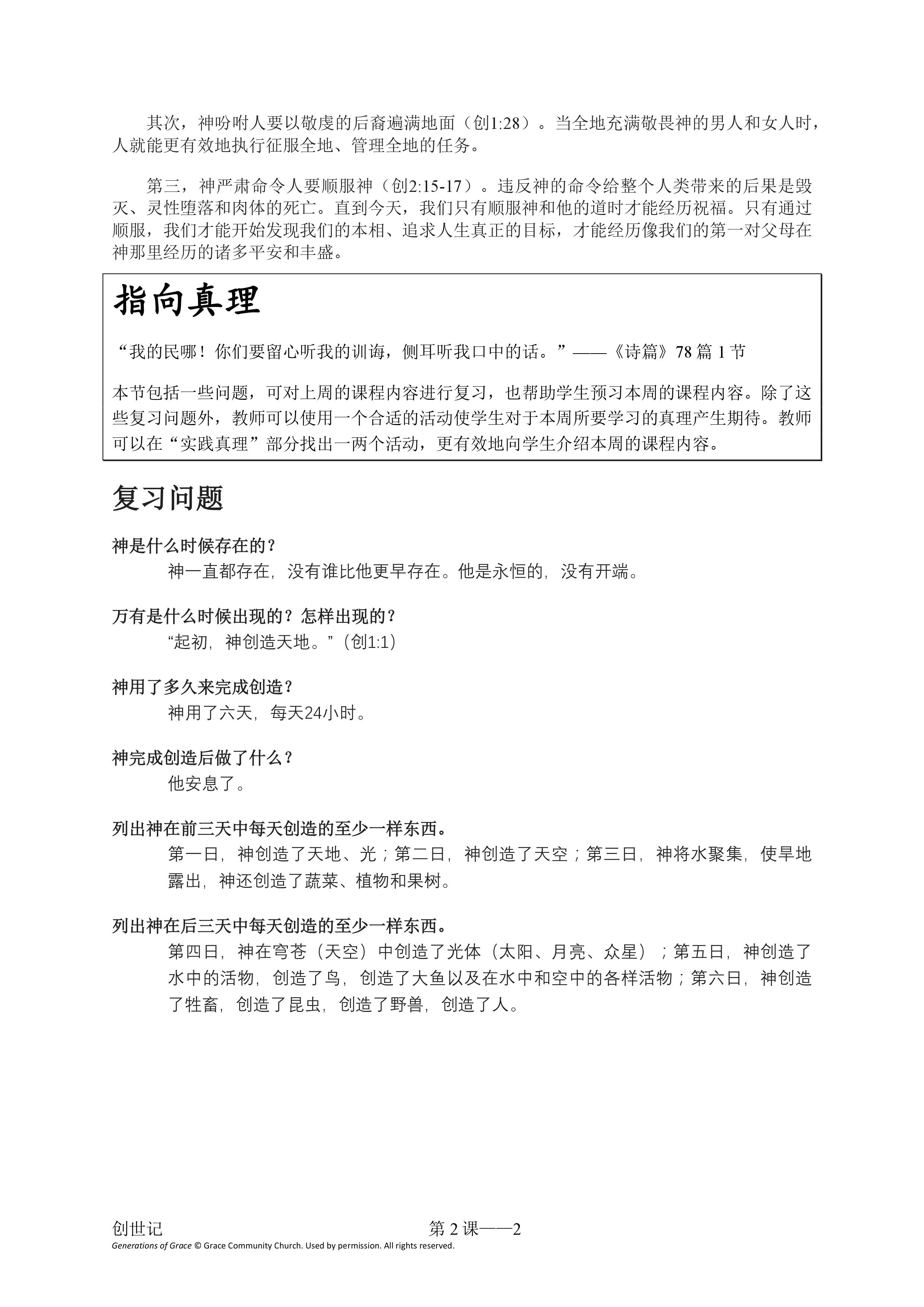本套课程体系包含的大多数“引导问题”(引导问题是为在孩子读完圣经经文后进行提问而设计)对于本阶段的学生来说比较难以回答。但是,教师可以参考这些问题和答案进行备课,并以此为框架进行授课。教师提问学生的问题应该简单明了。例如:神在第一天造了什么?是谁为动物命名?谁建造了方舟?