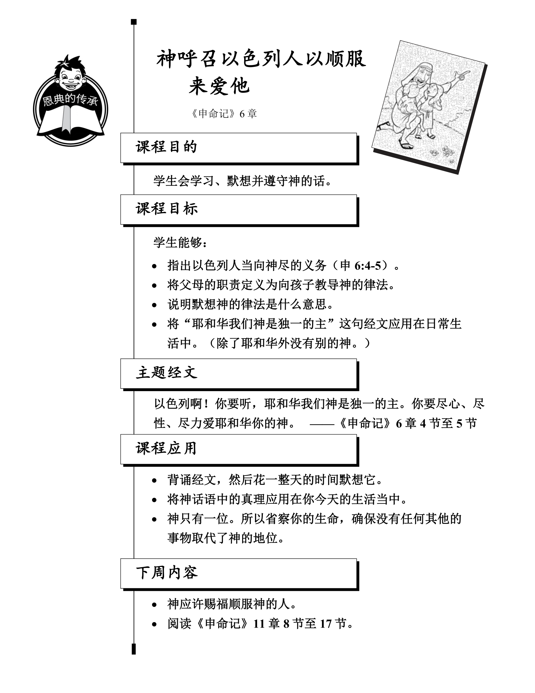每课以一页概览开始,内容包括课程目的、课程目标/主要真理、主题经文以及课程应用。你可以用来指导一周的学习和备课。“课概览”部分旨在帮助你评估学生的学习内容。这一页是整节课的大纲。我们有意识地加入了比一般课程更多的目的/主要真理。随着时间的推移,您就能衡量出学生能消化多少内容。