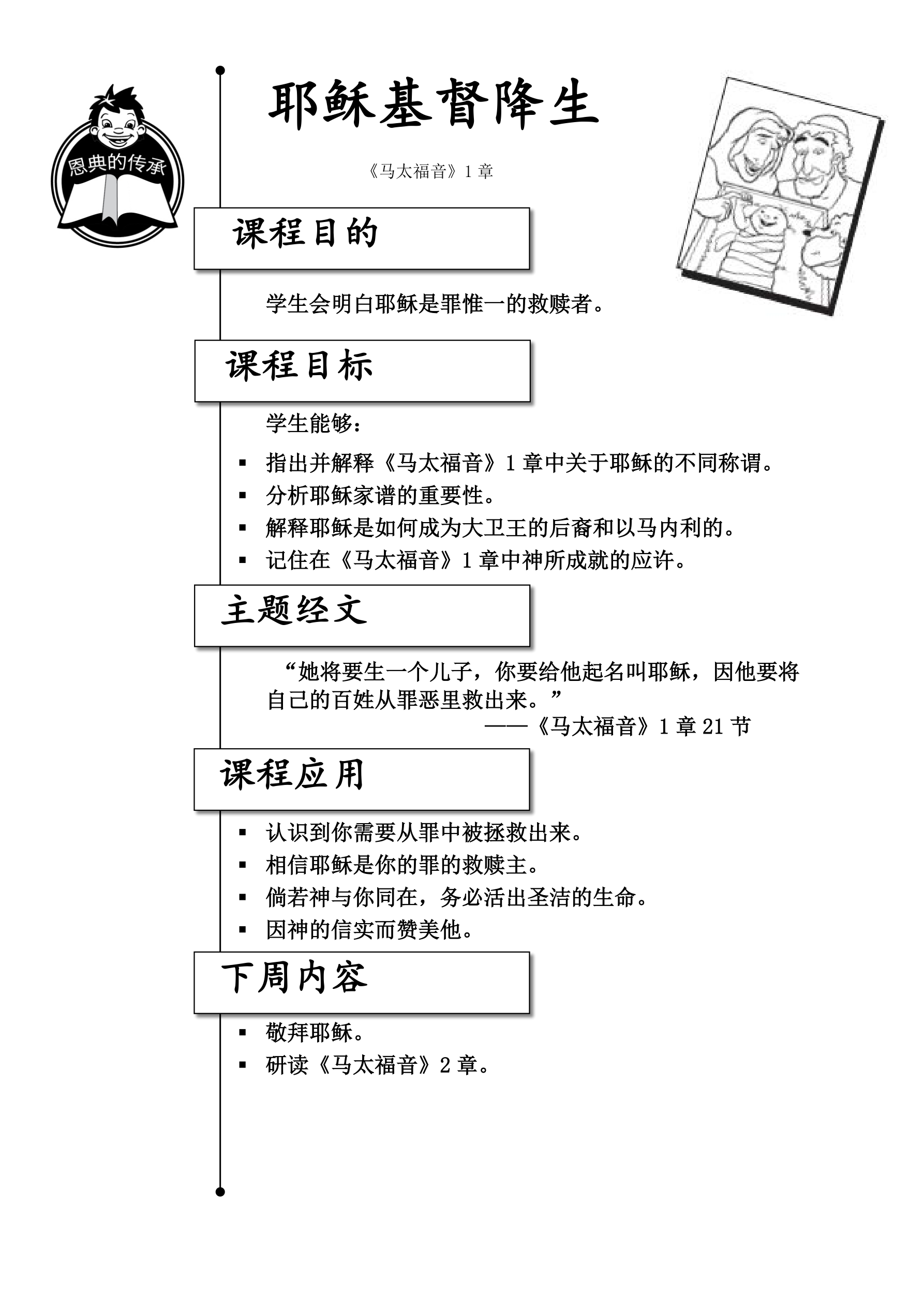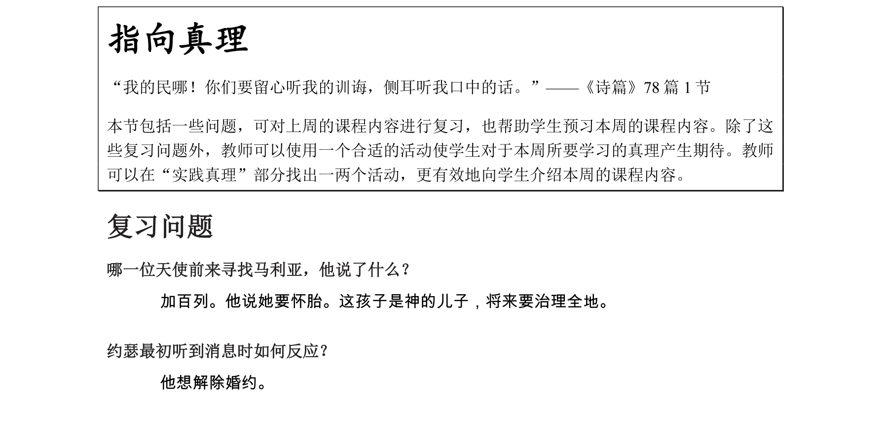 每课以一页概览开始,内容包括课程目的、课程目标/主要真理、主题经文以及课程应用。你可以用来指导一周的学习和备课。“课概览”部分旨在帮助你评估学生的学习内容。这一页是整节课的大纲。我们有意识地加入了比一般课程更多的目的/主要真理。随着时间的推移,您就能衡量出学生能消化多少内容。