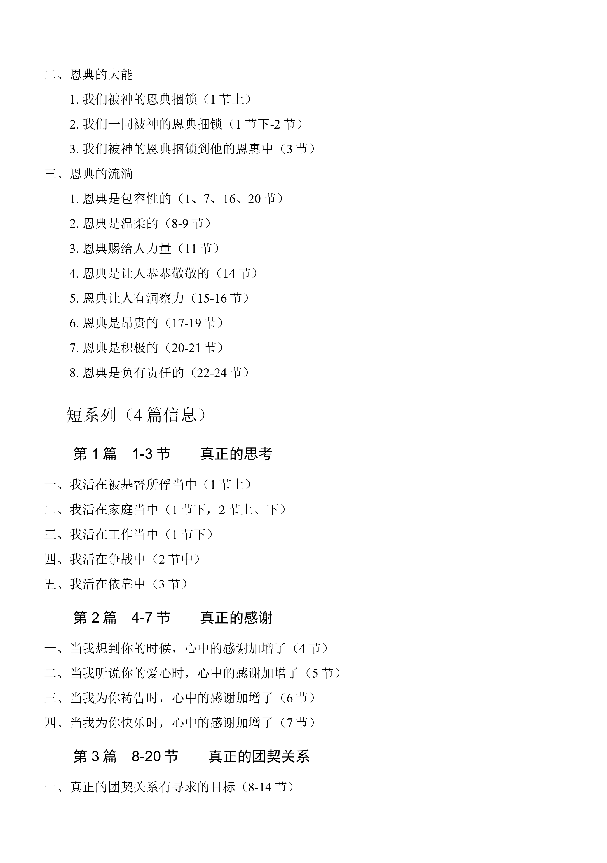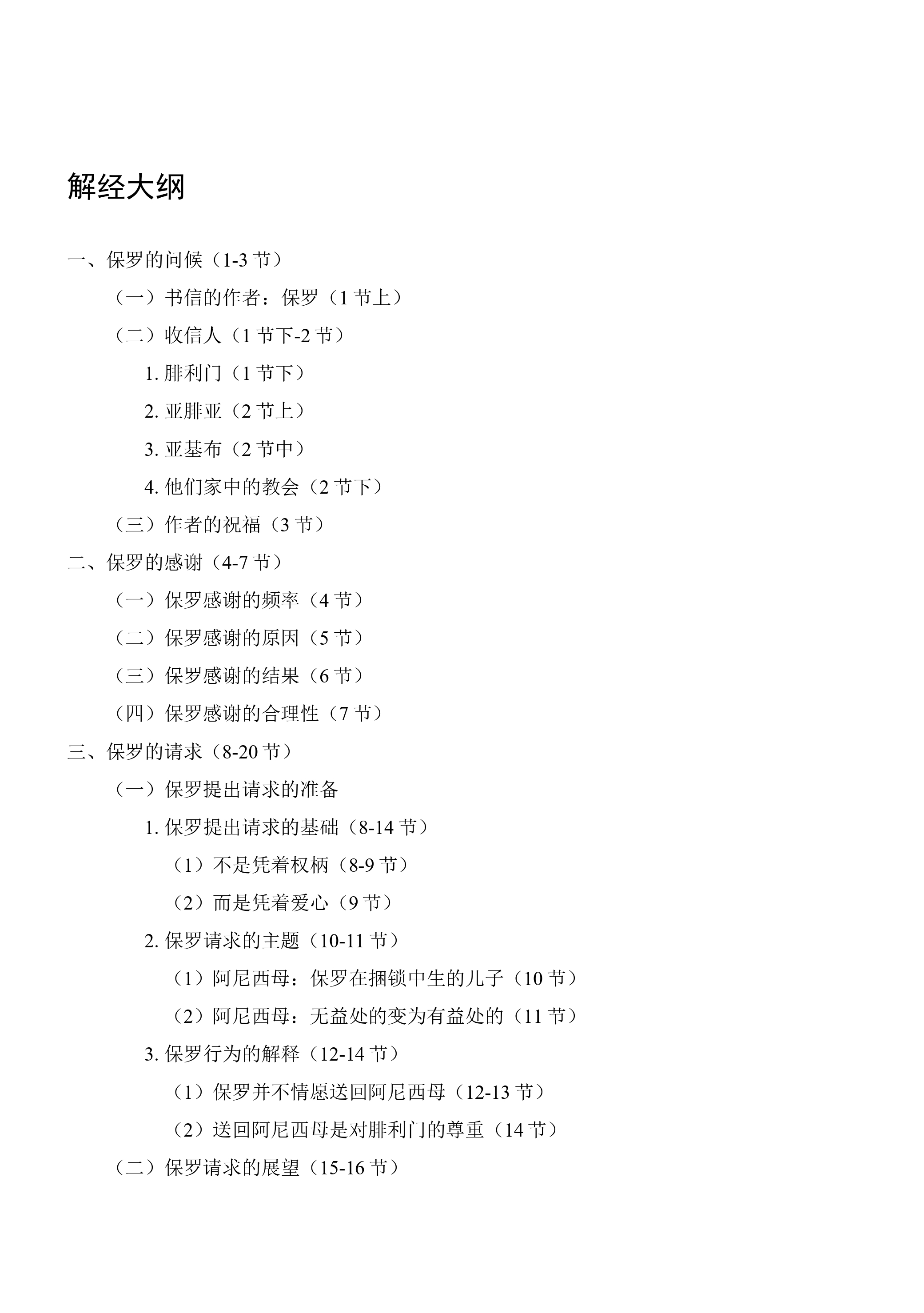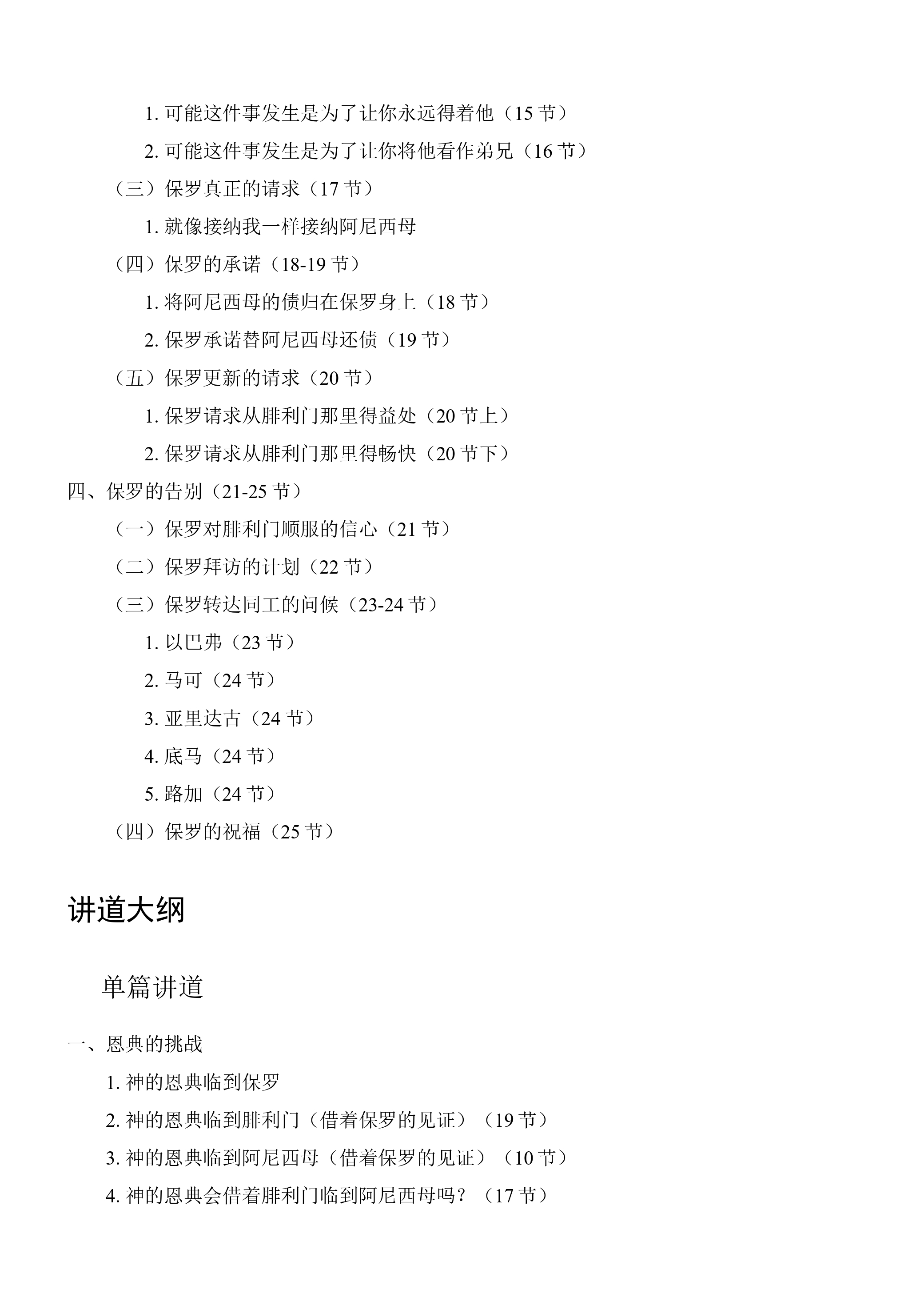 我们可以采取以下几种合理的方式传讲腓利门书这个短小的书卷。一眼看上去,你可能会说,这么短小的一封书信只适合讲一次道,或者划分为极短的系列。下面我举例说明这两种方式。但是我挑战你,请思考这封信的实际内容,以及是否可以划分一个较长的系列。下面是我为你提供的素材。
