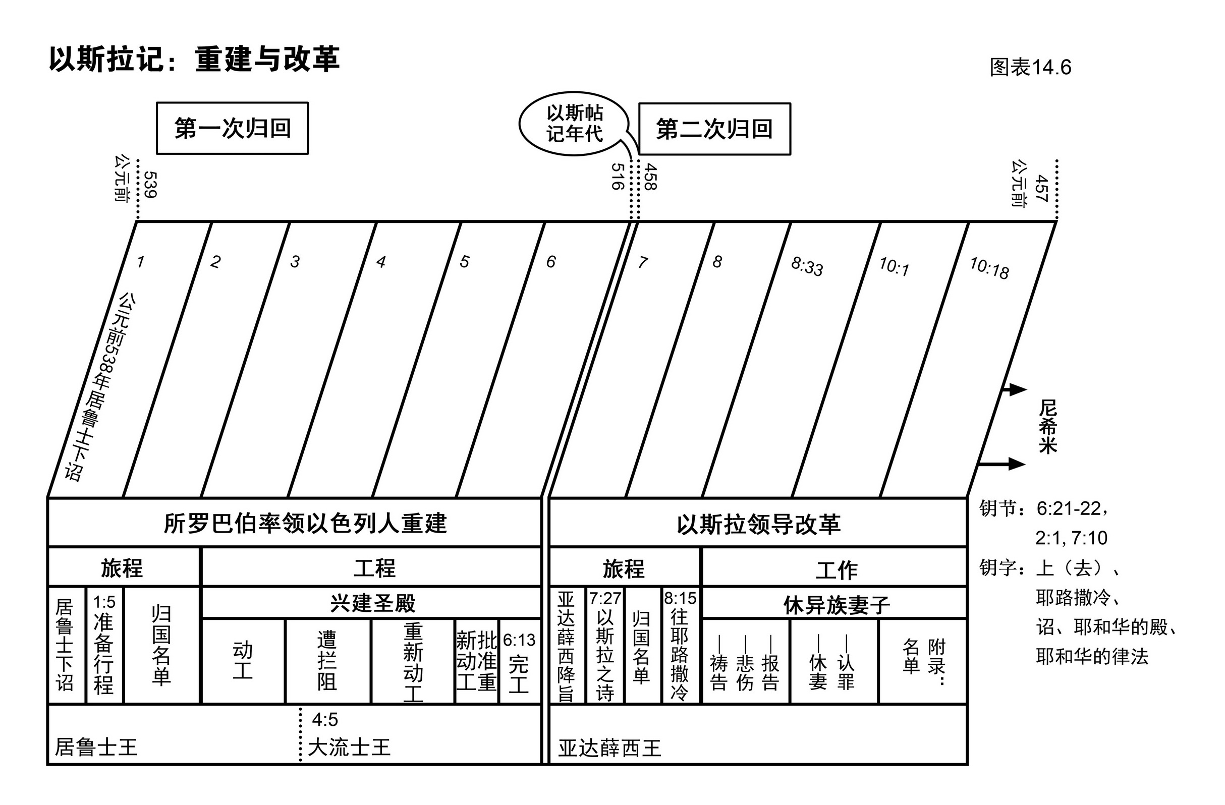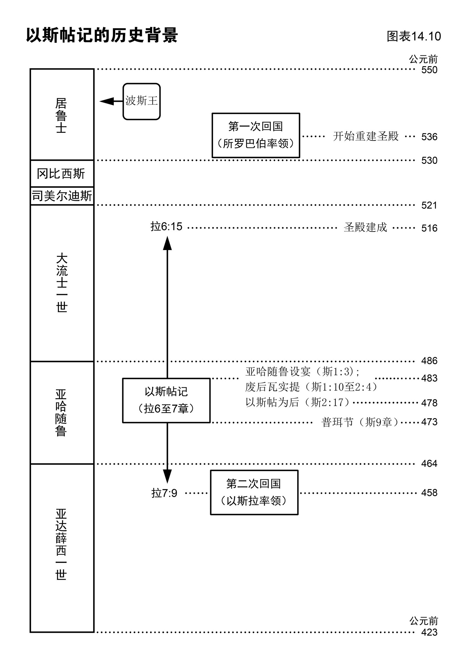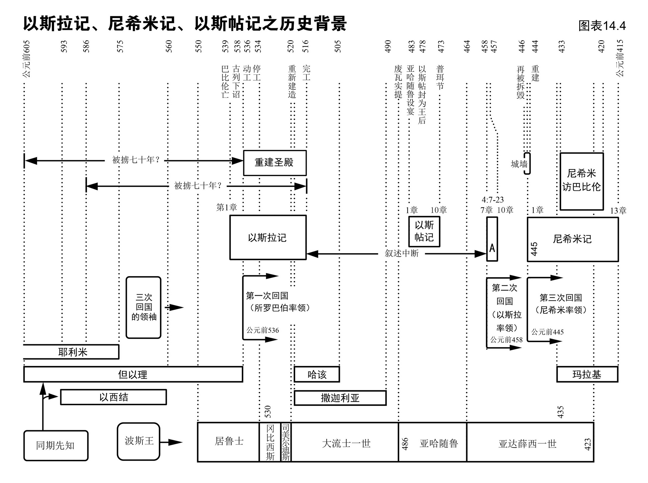 我们从图表14.4看到以斯拉记所记载之历史并不是按年份编排,而是根据要表达的思想内容取材。譬如说,圣殿落成之后(公元前516年)发生的事情,作者就省略不记录,直到以斯拉返回耶路撒冷(公元前458年),[11]才又再记录。这是圣灵的默示,我们读的时候须紧记这点。(公元前583至公元前425年间人所熟悉的犹太历史都已经记载在以斯拉记和尼希米记里。)