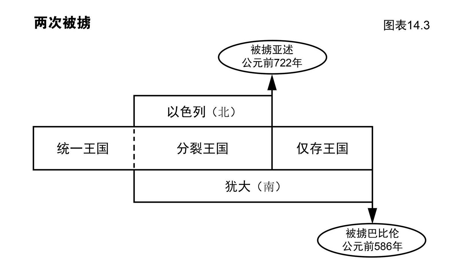以色列人有两次被掳,一次被掳亚述,一次被掳巴比伦。回国是指他们从被掳之地回归迦南。图表14.3为两次被掳。
