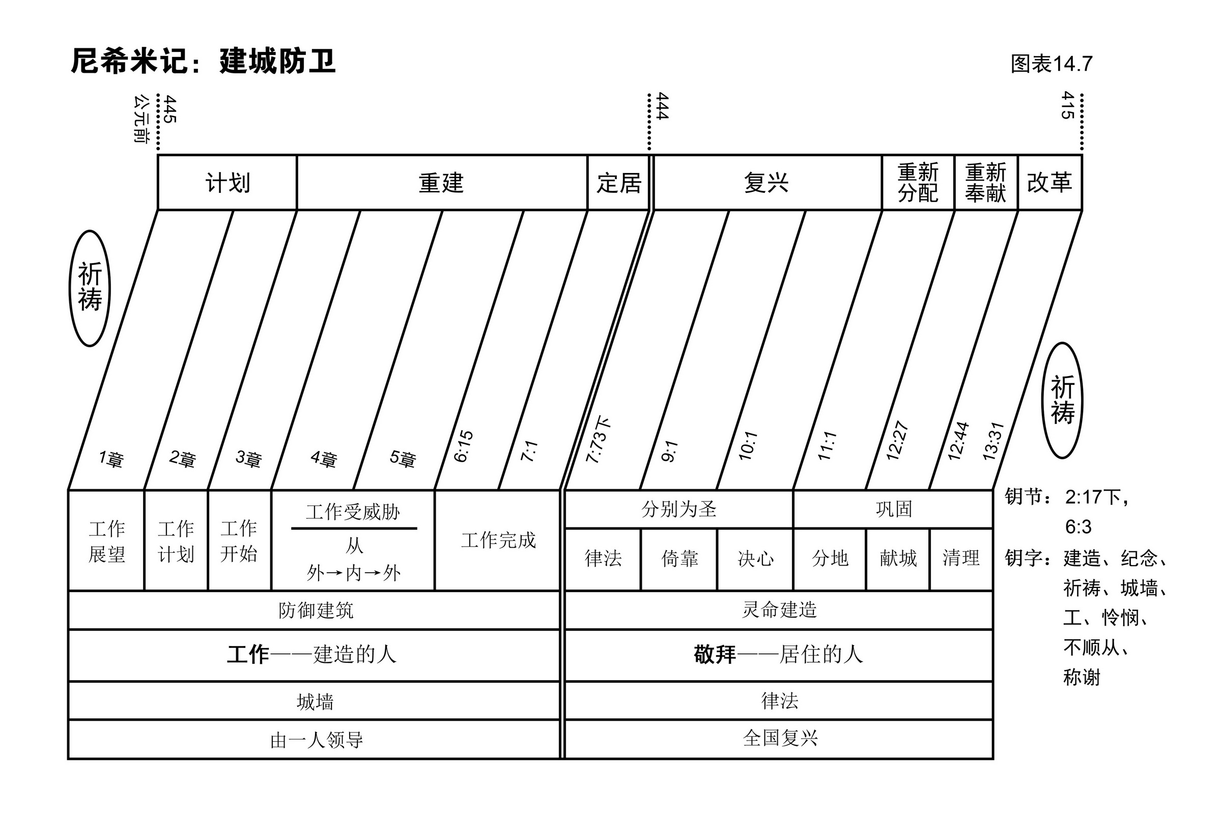 以斯拉记、尼希米记记载了以色列人从被掳之地回国,开始以色列人满有希望的新纪元。请大家按照图表14.2的大纲读这几卷书。