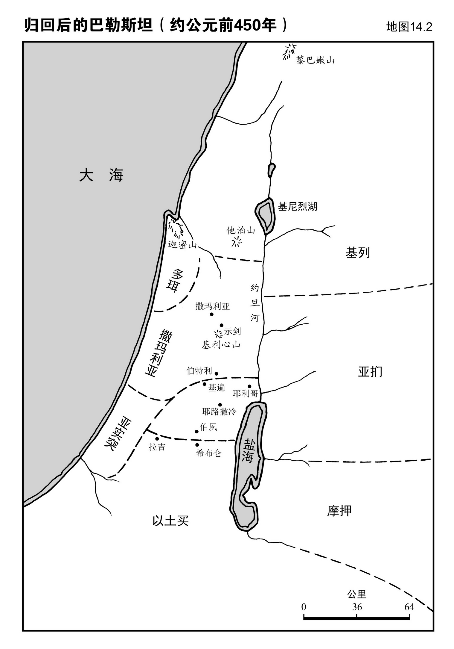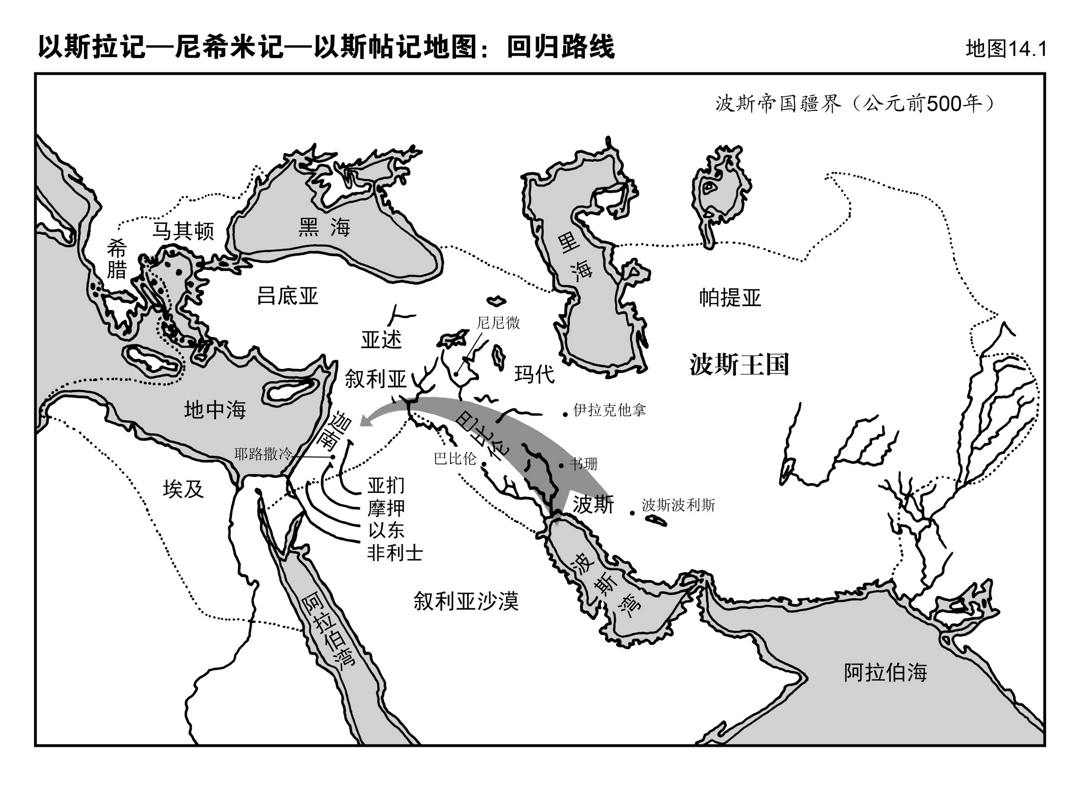地图14.1是以色列人归国路线,地图14.2是他们重返家园定居时巴勒斯坦的新局面。请参看这些地图。