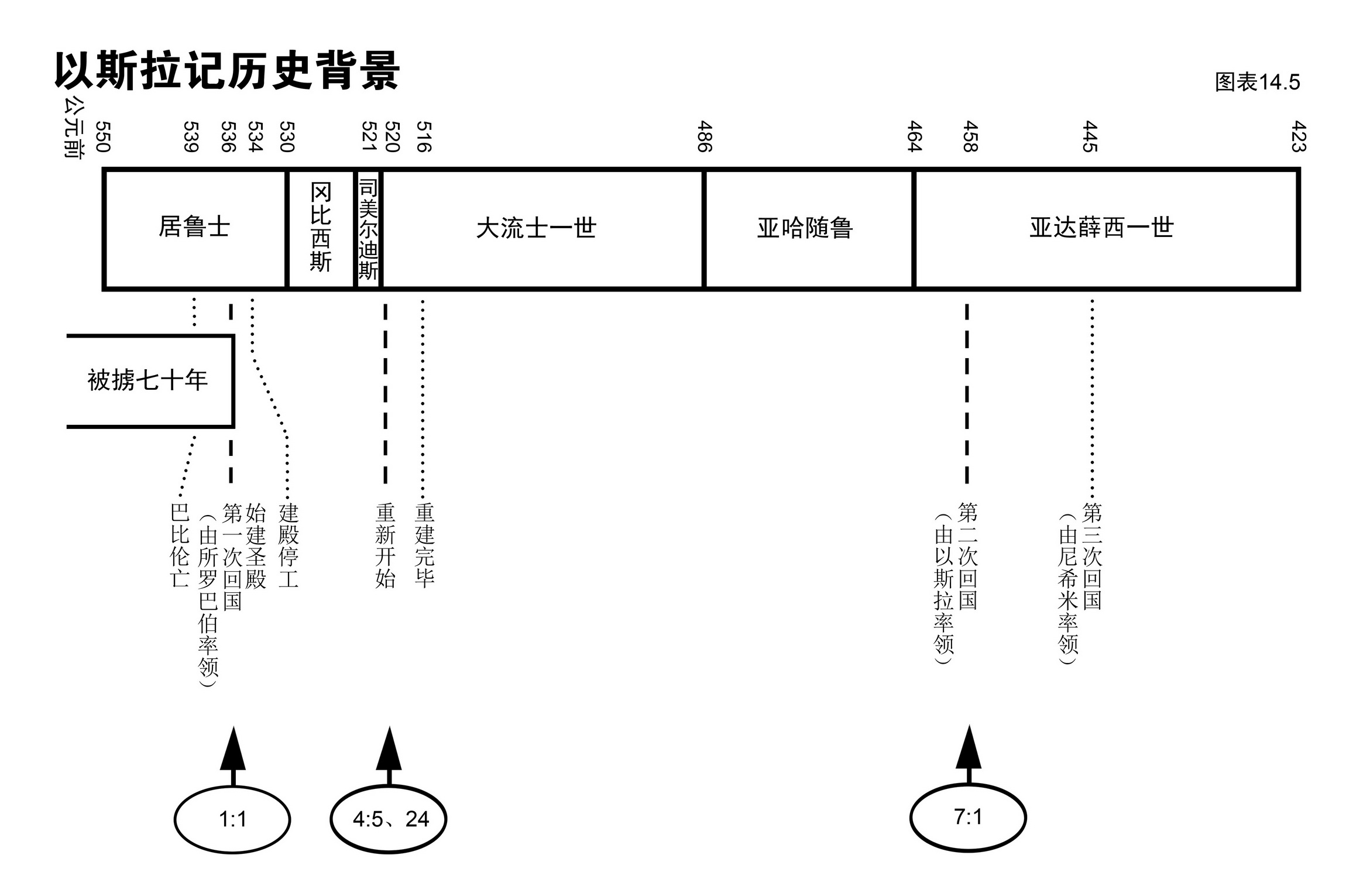 以斯拉记11节,45节和24节,以及71节,都提到波斯三位著名的王:居鲁士、大流士和亚达薛西。[10]他们的名字见于图表14.4,以斯拉记的历史和这些王的年代则见于图表14.5