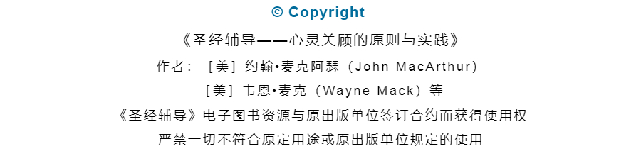 我们这群服侍于马斯特学院(The Master’s College)并参与此书编撰的同工,将《圣经辅导》献上,愿荣耀归与基督,愿上帝使用此书让他的子民得益处,这些人是他所深爱并舍身拯救的。我们祷告上帝使用此书装备牧者与平信徒,好开展建立基督肢体的事工。愿上帝喜悦使用书中所提供的理念与信息,使我们在坚固与修复圣徒灵命上更加专业,好让他得到原本属于他的荣耀与赞美。