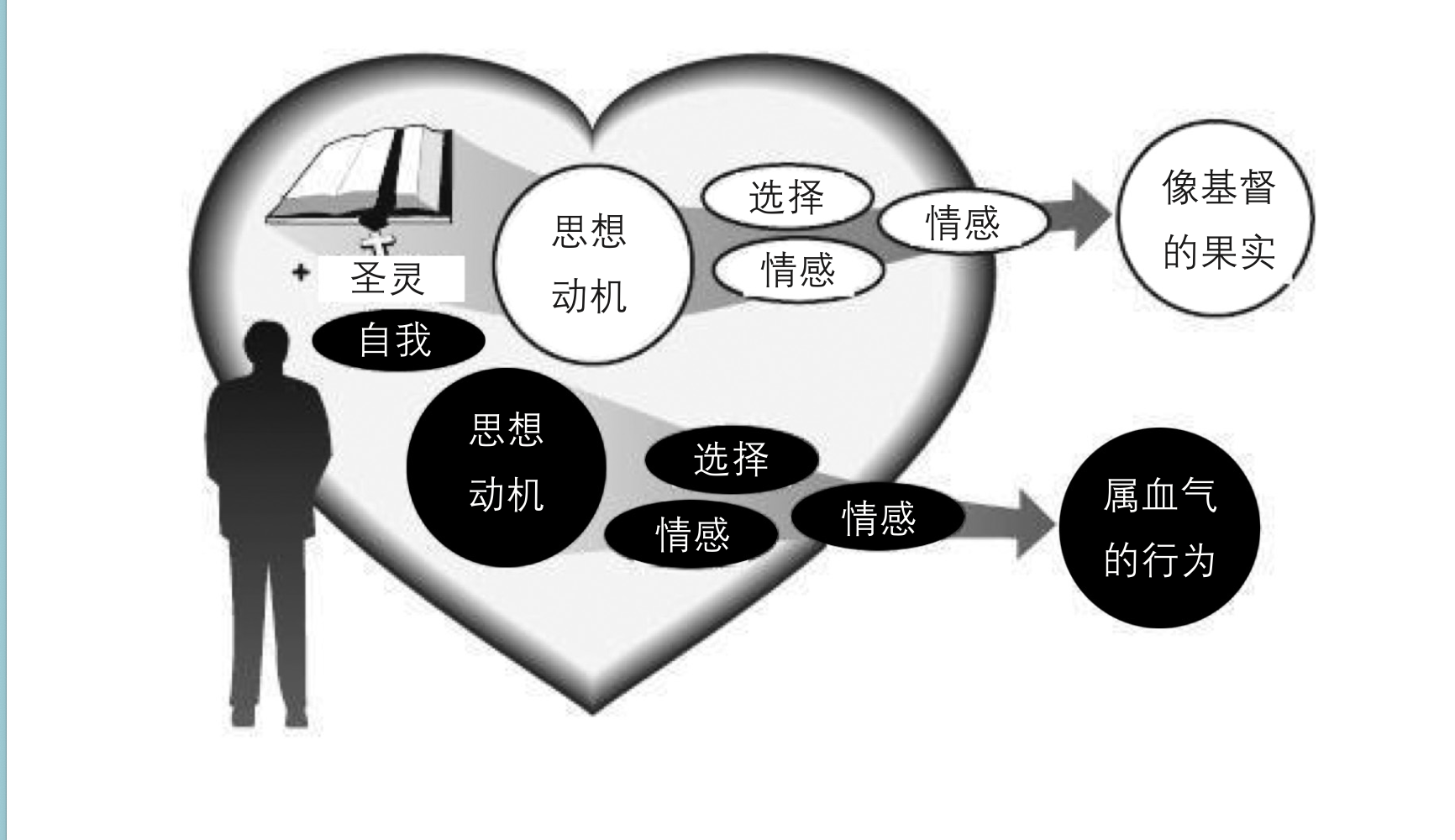 人的一切行为,都发源于他的某种动机、思想及信念,里面有了,就自然流露出来。因此,我们必须让我们的心意得到更新。我们用下图来说明这个事实: