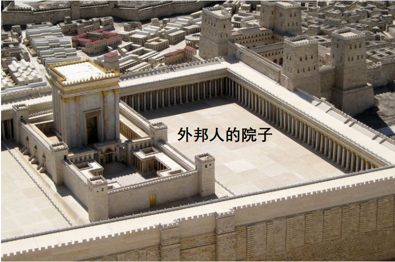 亚那就是在这里设立商人摊桌的。当耶稣推倒桌子时,祂的话阐明了神对外邦人的院子的意图。祂说:“经上记着说:‘我的殿必称为祷告的殿’,你们倒使它成为贼窝了。”[17]耶稣是在引用先知以赛亚所说的话。耶稣表述的语境提供了有益的洞见。在耶稣引用以赛亚书那句话的前文,我们可以读到:“还有那些与耶和华联合的外邦人,要侍奉他,要爱耶和华的名,要作他的仆人……”[18]在引文之后可以读到:“因我的殿必称为万民祷告的殿”[强调为附加]。[19]
