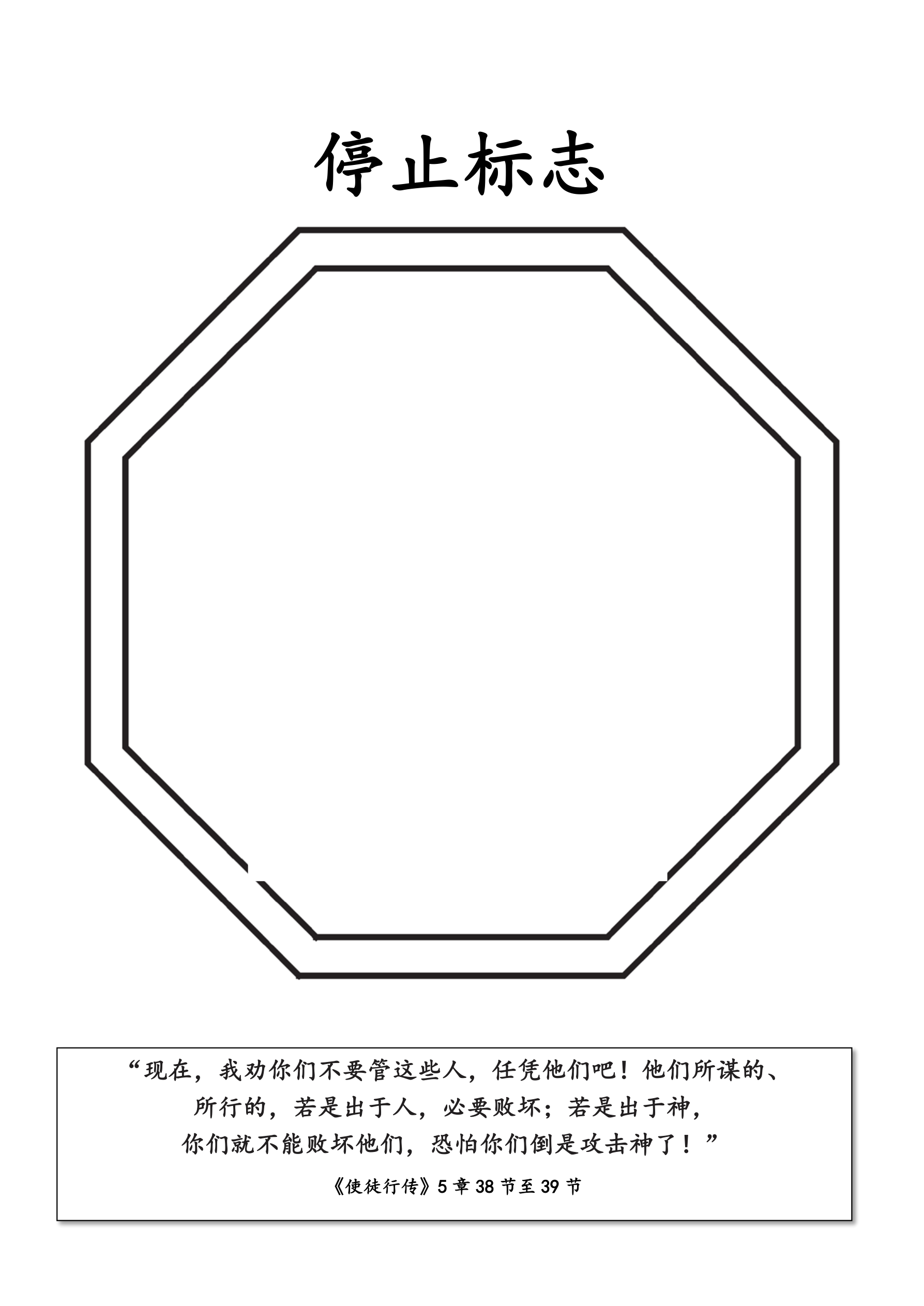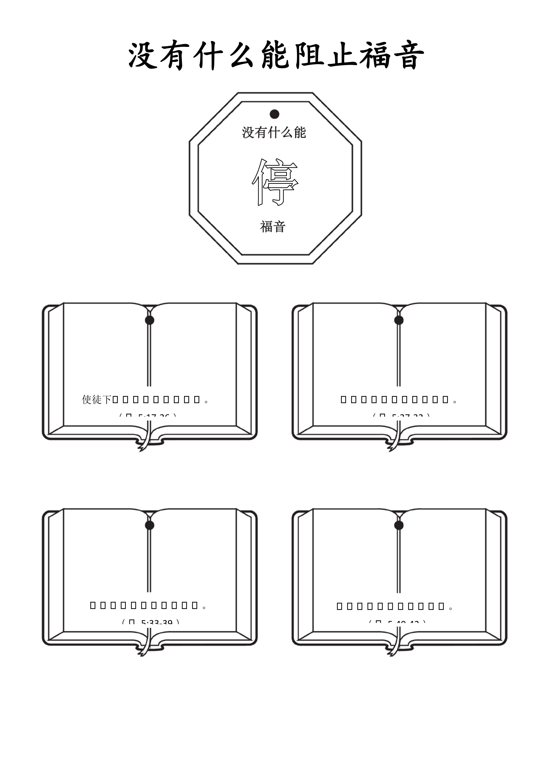 课堂说明:给每个孩子分发手工页,指导孩子们沿着四张打开着的圣经页裁剪,并剪下停止的标志。给孩子时间给圣经页配图,用以说明经文的每一部分。完成后,指导孩子们在指定的地方打孔,并将线穿入圣经页和停止标志。提醒孩子们没有什么能阻止福音。