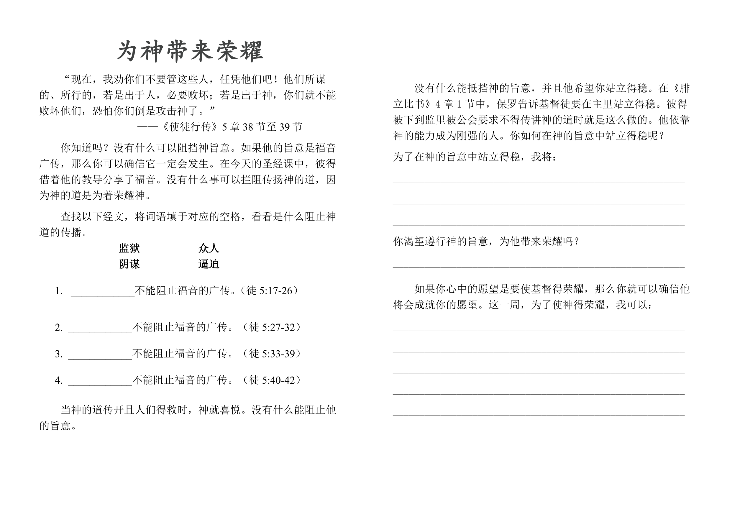 课堂说明:给孩子每人一份手工页复印件,让他们给上面的标志上色后剪下那个标志和经文。将标志用胶水粘到手工棒上,并将经文贴到标志的反面。上课期间,当讲到监狱、人或者阴谋都无法阻止福音的传扬时,孩子们可以举起手中的标志牌。