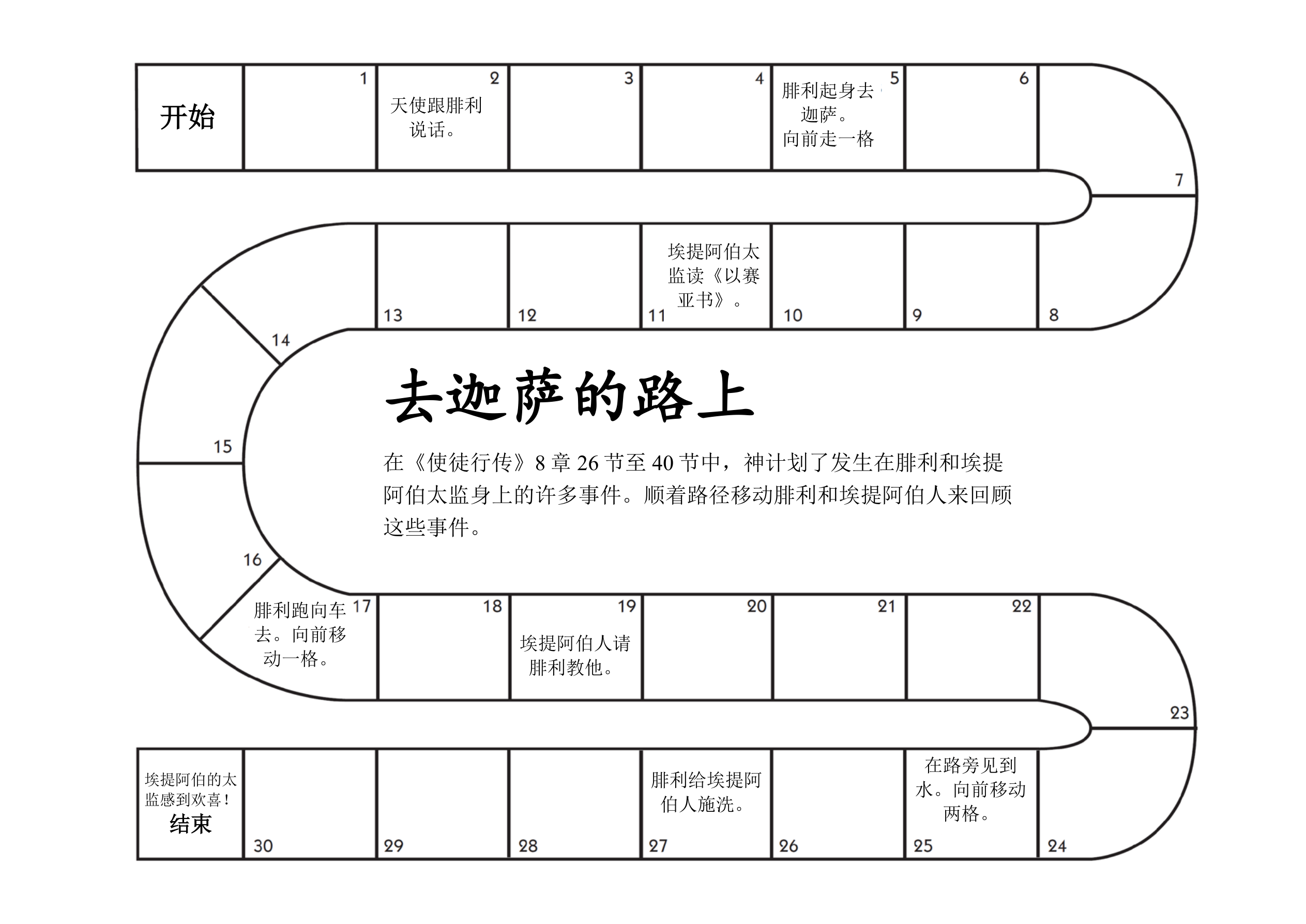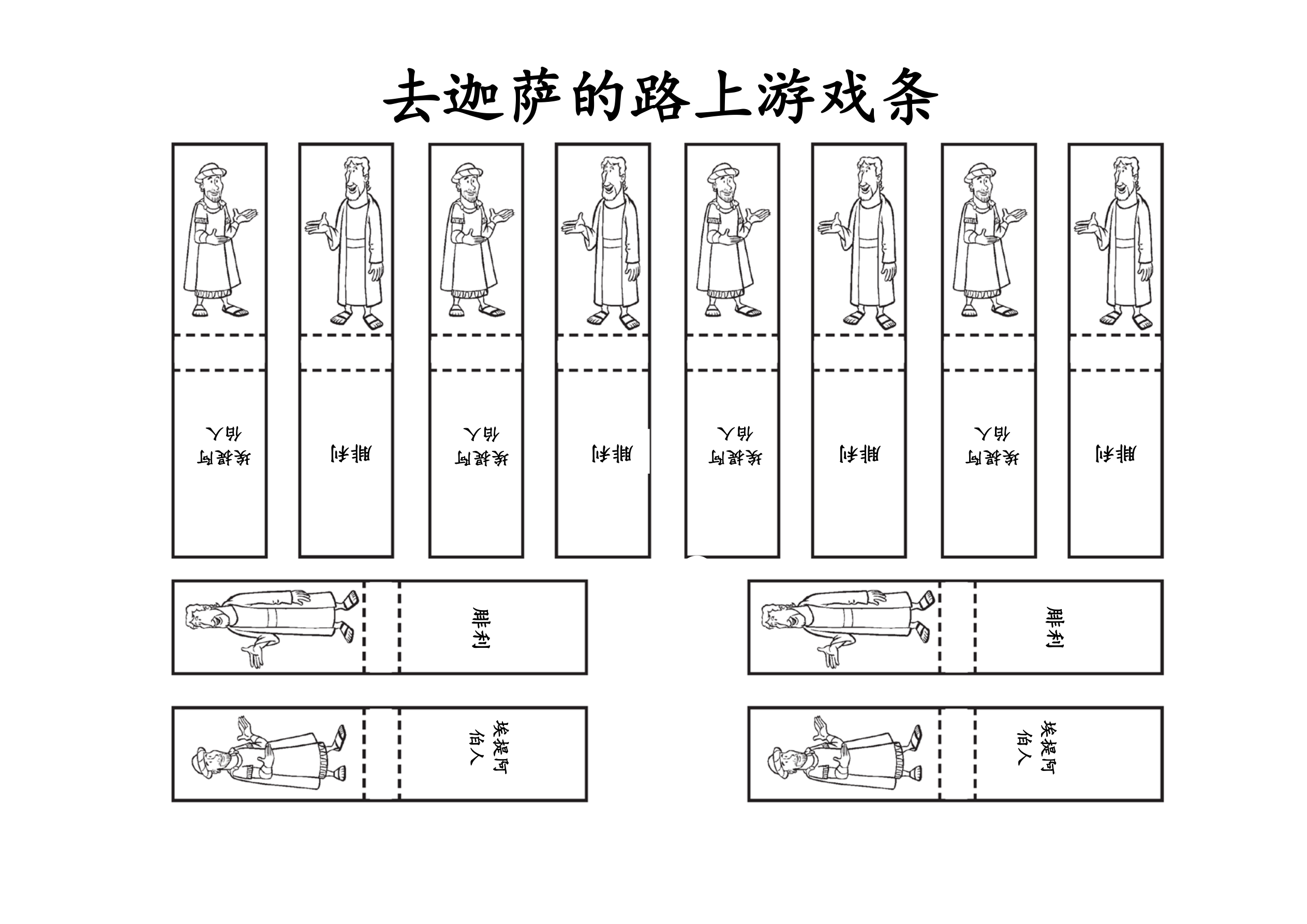 课堂说明:给每位学生一张手工页的复印件及在篮子中的扫罗。在手工页人手下面以及篮子打结的地方分别打一个孔,将线从孔中穿过并打结系好。学生们可以拉线把扫罗放下。