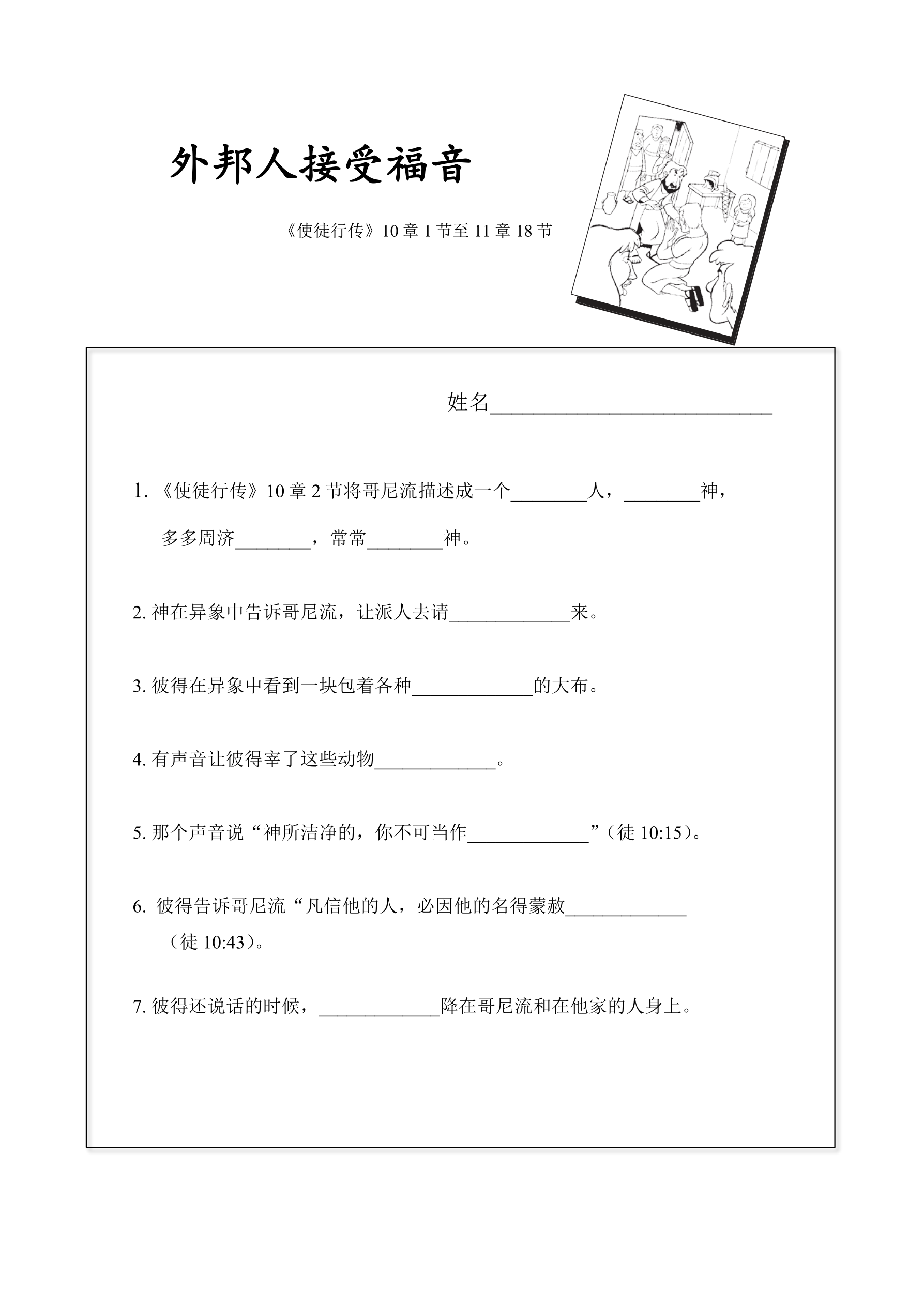 所需材料:“哥尼流派人请彼得,彼得对外邦人讲道”的手工页复印件、每位学生两根约3-5厘米的吸管、一根约20厘米长的线、铅笔、蜡笔和胶带。