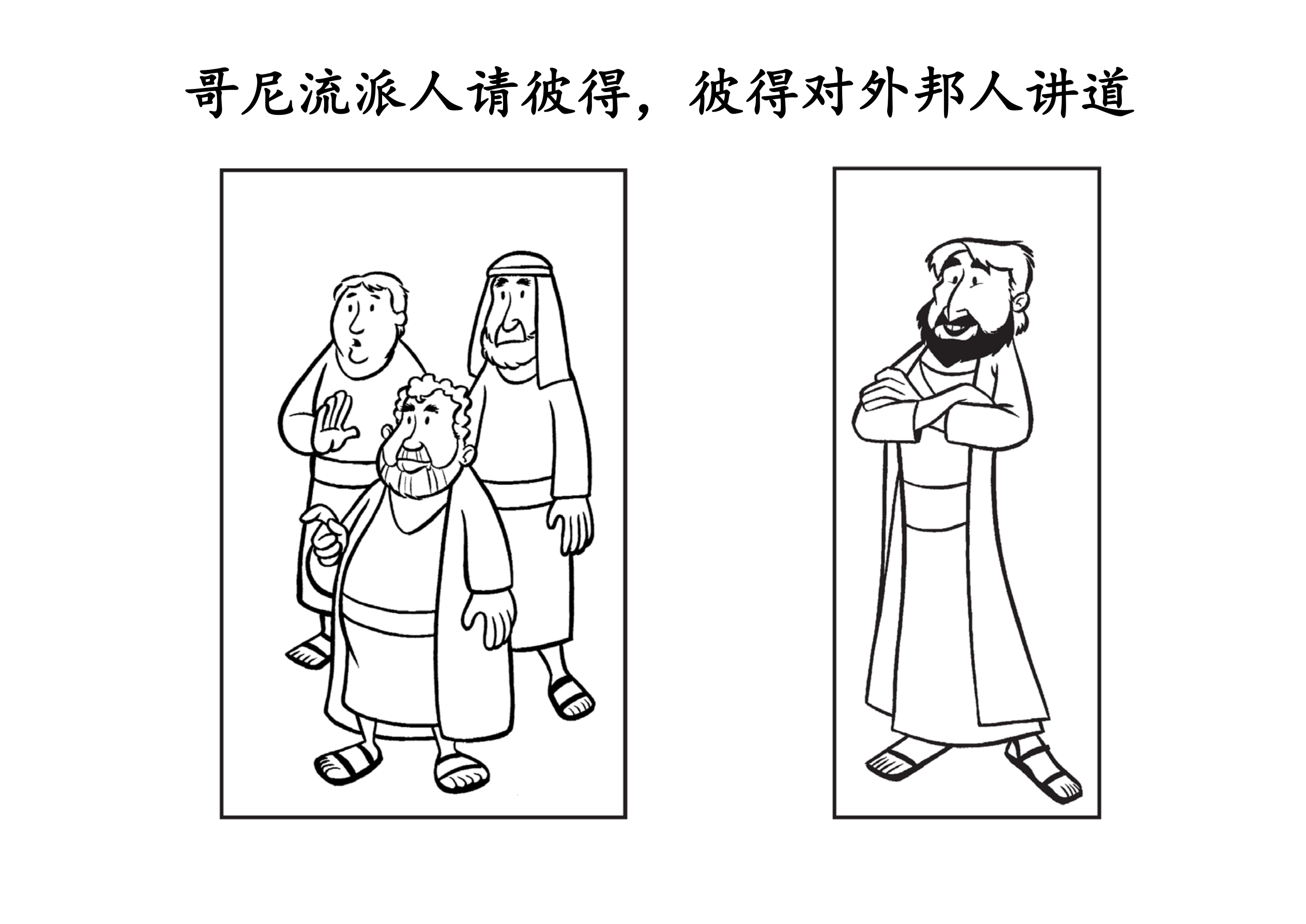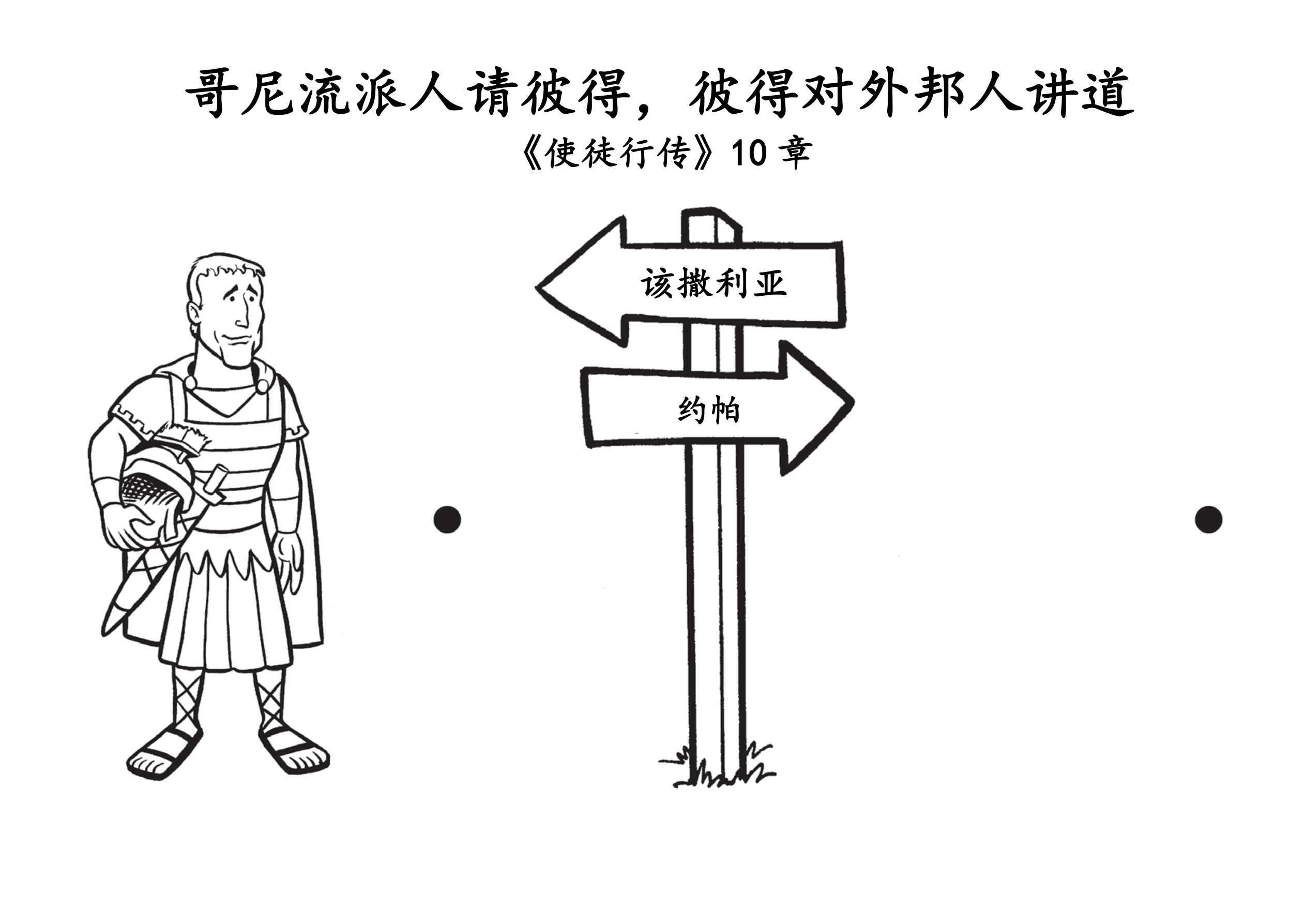 课堂说明:让孩子们将手工页上色并装饰后,把上面的那群人和彼得贴纸剪下来。帮助孩子们在指定的地方用铅笔戳洞,然后用线穿过吸管。接下来,帮助他们将线穿过所戳的洞,并将线头用胶带贴在手工页背面。最后,将人物贴纸按正确位置贴到吸管上。顺着线滑动人物,表示哥尼流派的人去往约帕带回彼得。