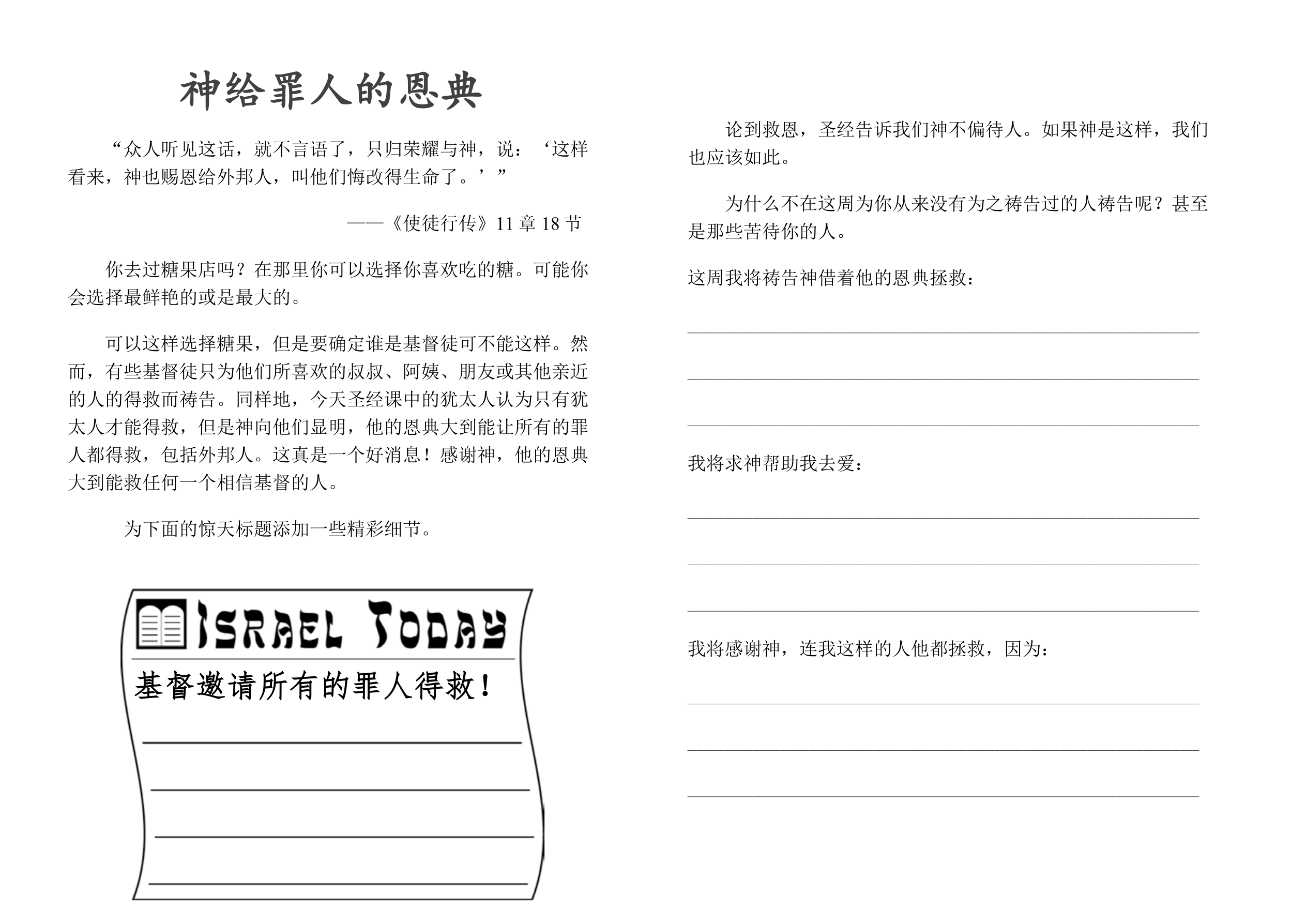 你有没有在读某张地图或某本说明书时却发现读不懂?虽然一开始这些说明看起来有些怪或者不一样,但是它们往往被证实是正确的,并且能帮助你达到你的目的。犹太人在今天的课中也有类似的经历。多年来,神的救恩计划只包括以色列人。但是在《使徒行传》10章至11章中,犹太人看到神的救恩计划是他们从未预料到的。要看看神关于福音的启示,就让我们来看看《使徒行传》101节至1118节。