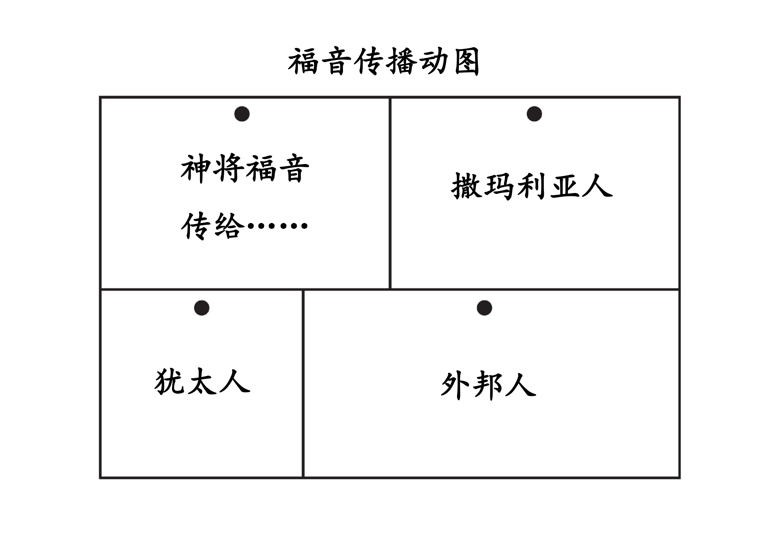 课堂说明:给孩子们人手一份复印在卡片纸上的手工页,上色并装饰。然后剪下每个方框,将经文卡片和其他卡片配对。在指定的地方打孔后,将卡片用线按顺序连到一起(顺序是1. 神派了…… 2. 犹太人;3. 撒玛利亚人;4. 外邦人)。在手工作品上方用线系一个环以便悬挂。