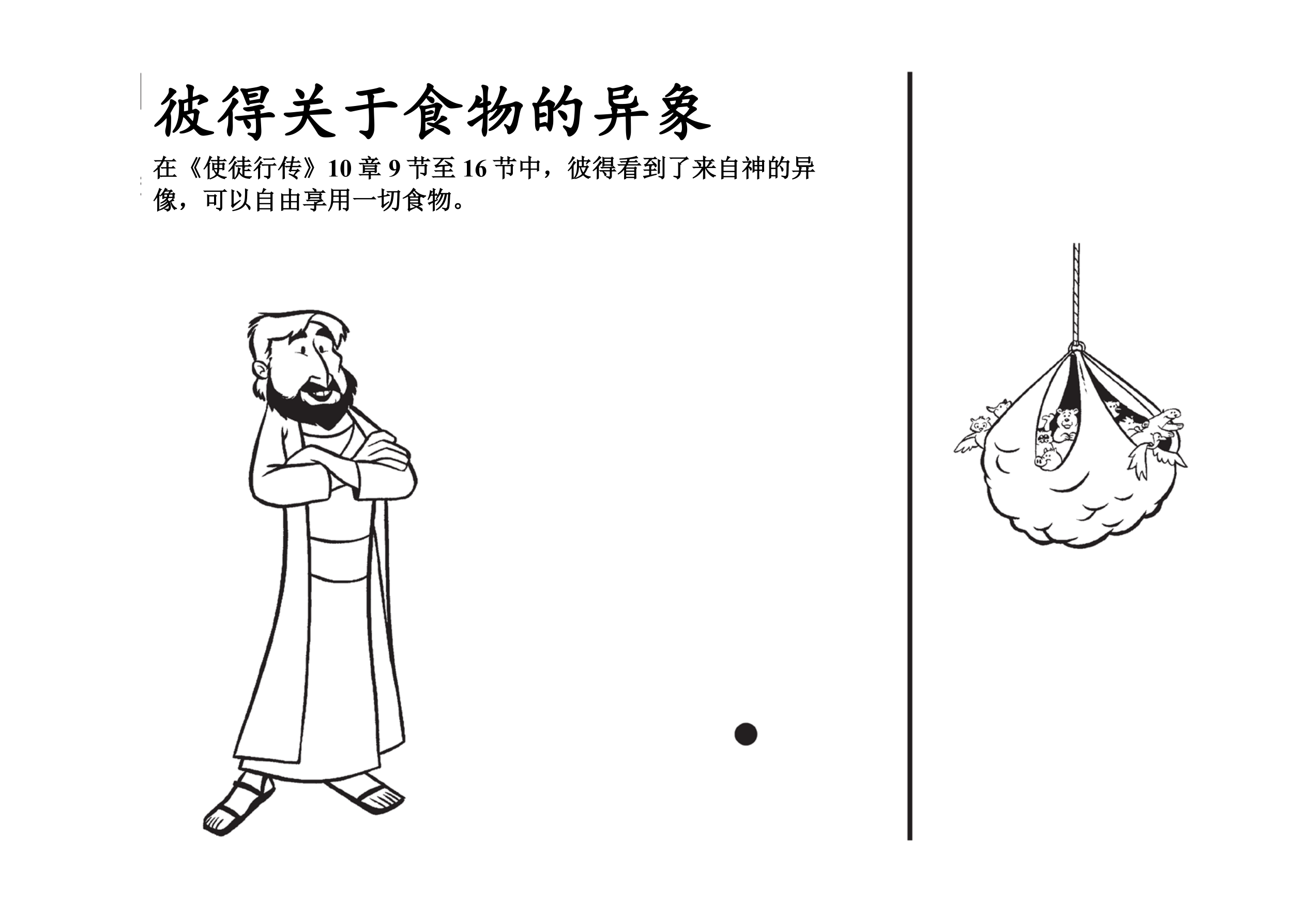 所需材料:“彼得关于食物的异象”手工页复印件,每位学生一根长约3-5厘米的吸管,约18厘米的线、铅笔、剪刀、胶带、蜡笔或其他装饰用具。