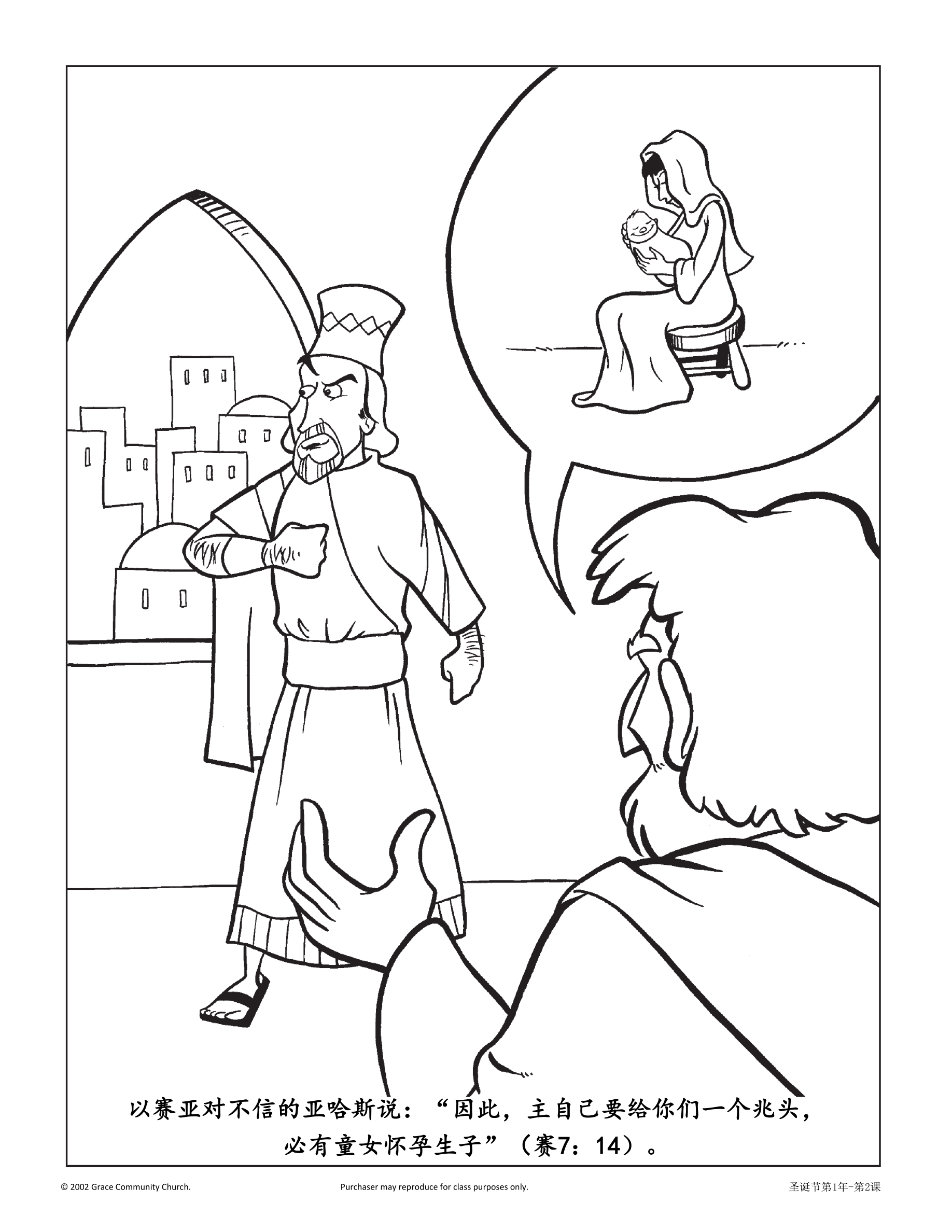和孩子们解释:耶稣在历史上特定的时间降临人世,有了人的位格。解释后告诉孩子们今天的课上会有一个特殊的客人——前来拜访的以赛亚(当然是由普通人扮演的)。这位“以赛亚”身着历史古装,能讲述亚哈斯王的问题、亚哈斯王有多害怕以及神给亚哈斯王做出了什么样的承诺。“以赛亚”还能讲述有关他的另一个朋友弥迦的故事,就是那位预言耶稣会出生在伯利恒的先知。这位特殊的客人可以带一些耶路撒冷和伯利恒的照片,或许他还可以教一部分或者这一整节课。