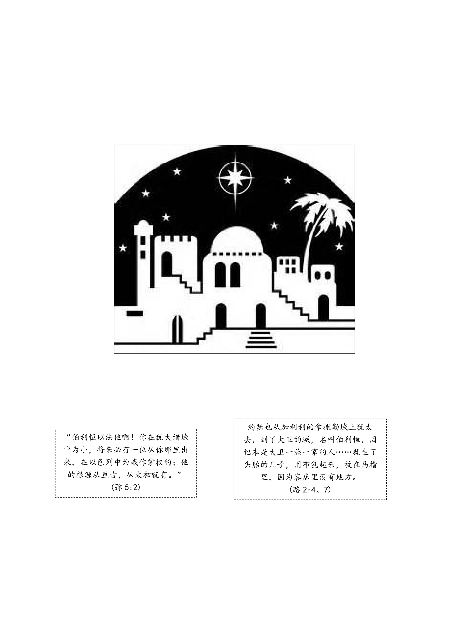 剪下伯利恒的图片(见附件)。给每个孩子一份打印出来的经文:《弥迦书》5章2节;《路加福音》2章4节、7节。