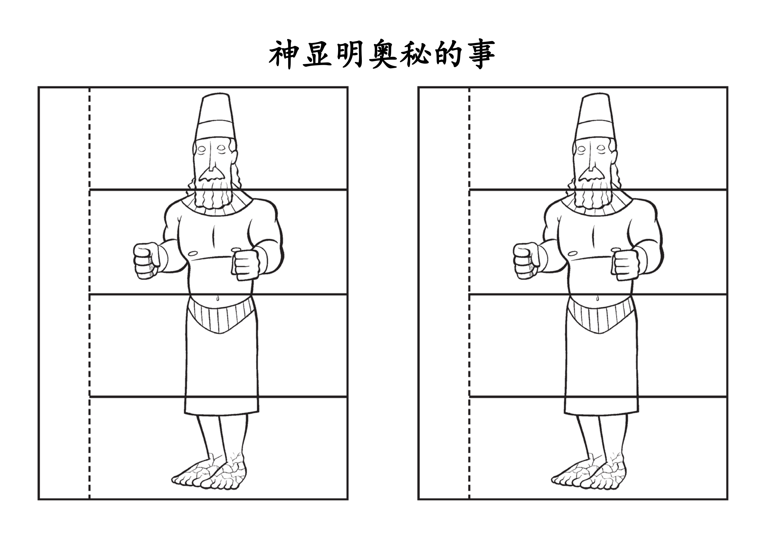 课堂说明:指导孩子们对印有大雕像的盒子进行裁剪。用蜡笔或者发光小饰品将大像的各个部位涂上不同的颜色。然后让孩子们顺着黑色的线进行裁剪,形成立体像,在左手边留个标签。把标签贴到“神显明奥秘的事”的模板上,然后沿虚线将标签向后折叠,这样就可以读出尼布甲尼撒王梦中每个部分的含义。