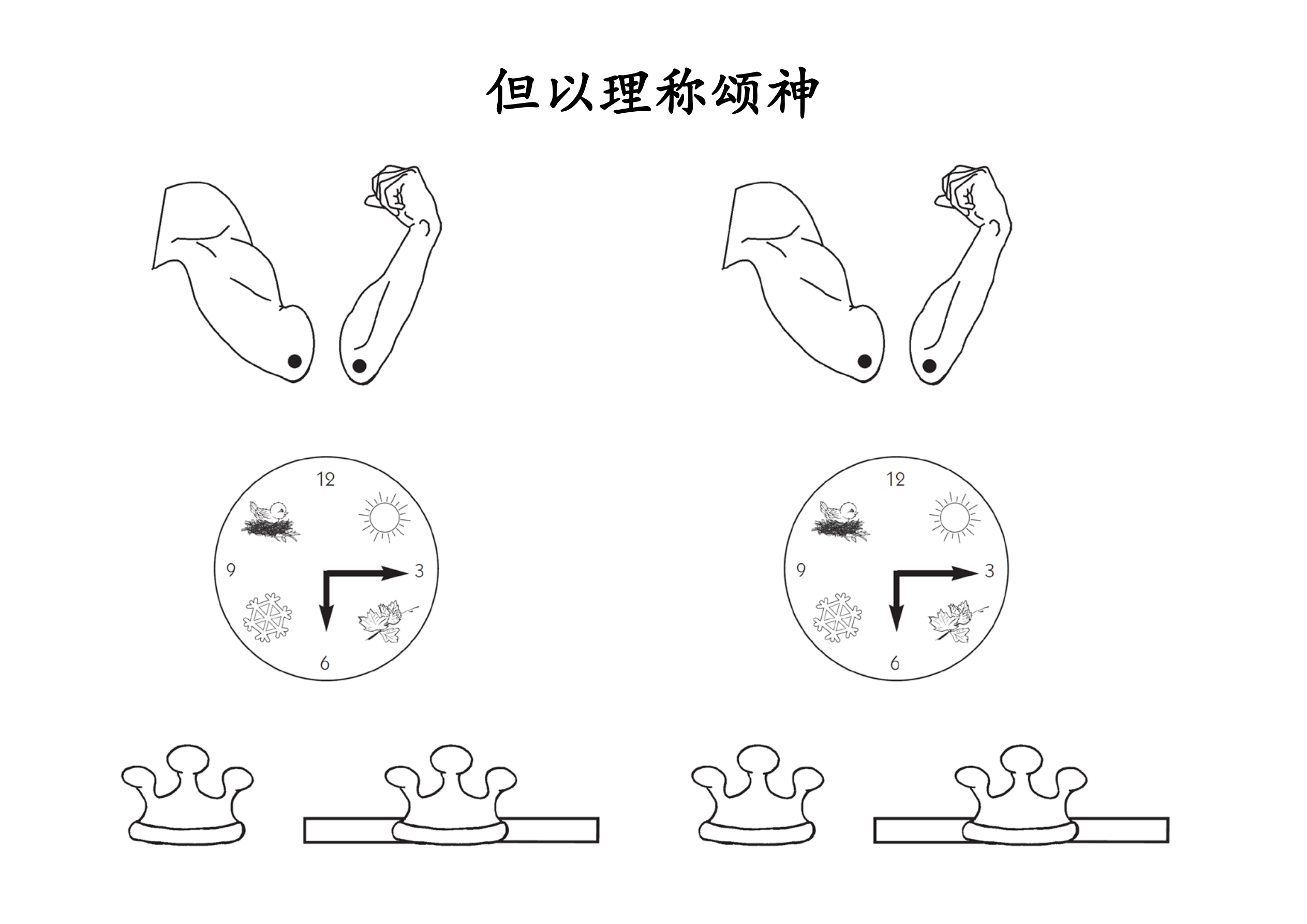 孩子们还需要将强健的胳膊剪下来,给孩子们示范如何将无头钉钉到胳膊肘旁的圈圈上,然后钉到第一个方块的点上。强健的胳膊象征上帝的大能。