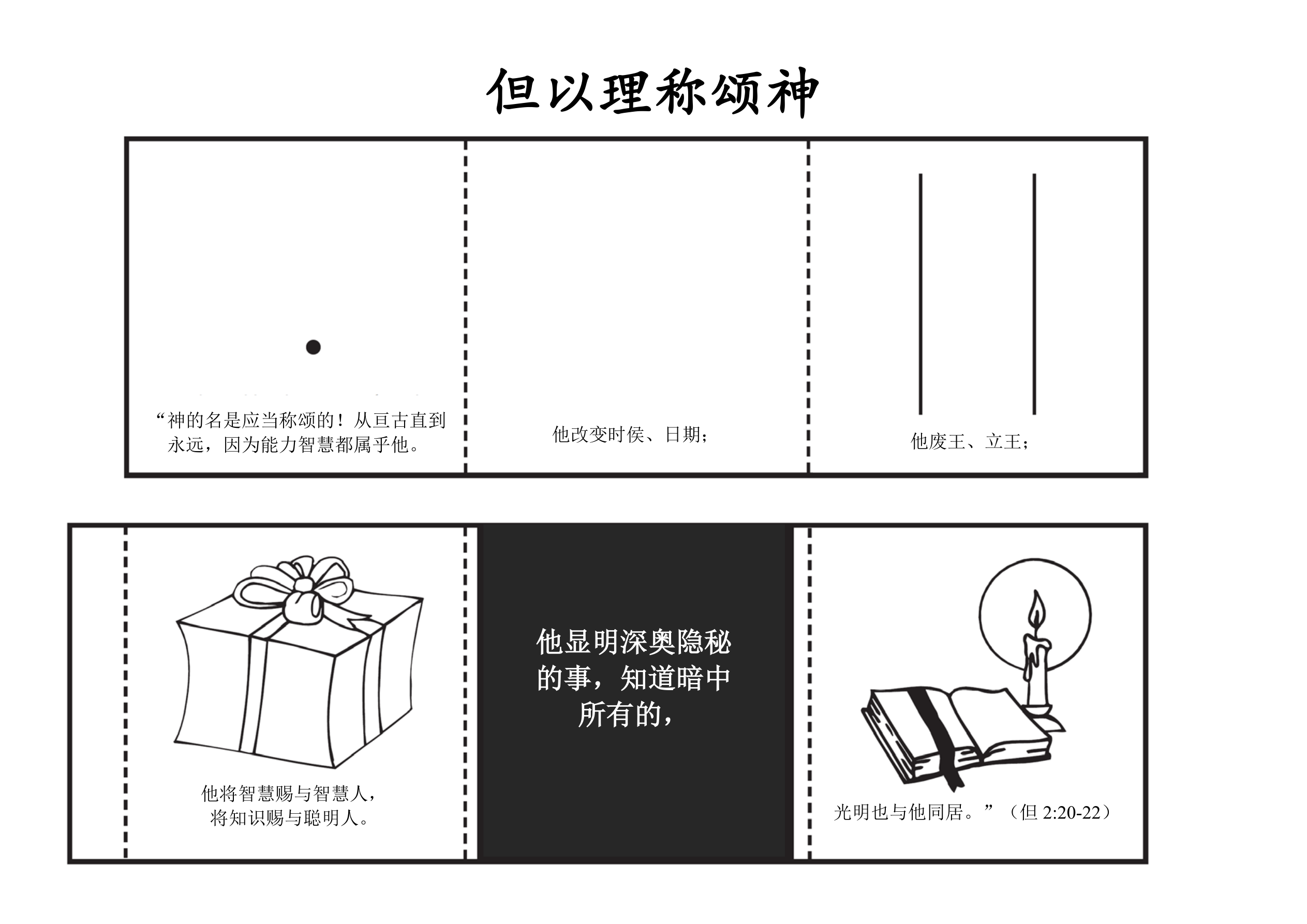 所需材料:“但以理称颂神”手工页的复印件、剪刀、胶水、无头钉(保证每个孩子一个)、透明胶带和蜡笔。
