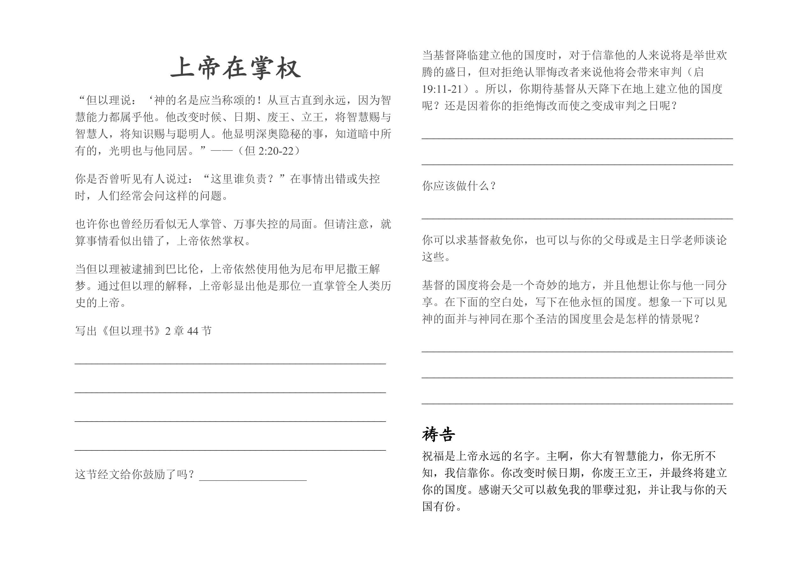 和孩子们讨论一下什么是主权。问问孩子们如果一个王想要他的仆人为他做什么,会出现什么结果?王可以得到他想要的吗?答案是可以,因为王拥有国家至高无上的主权。神也是最高的统治者,而神的主权远远高于地上的王的主权。神掌握历史上发生的一切,也掌握着每个人从出生那一刻开始的生活。神知道每个人身上会发生的每件事情,也知道每个信他是救主的人。我们可以通过什么样的方式相信神是我们生命的王呢?