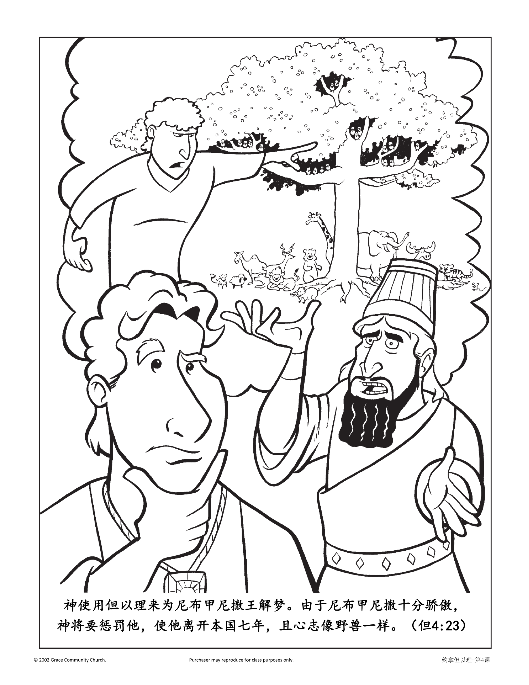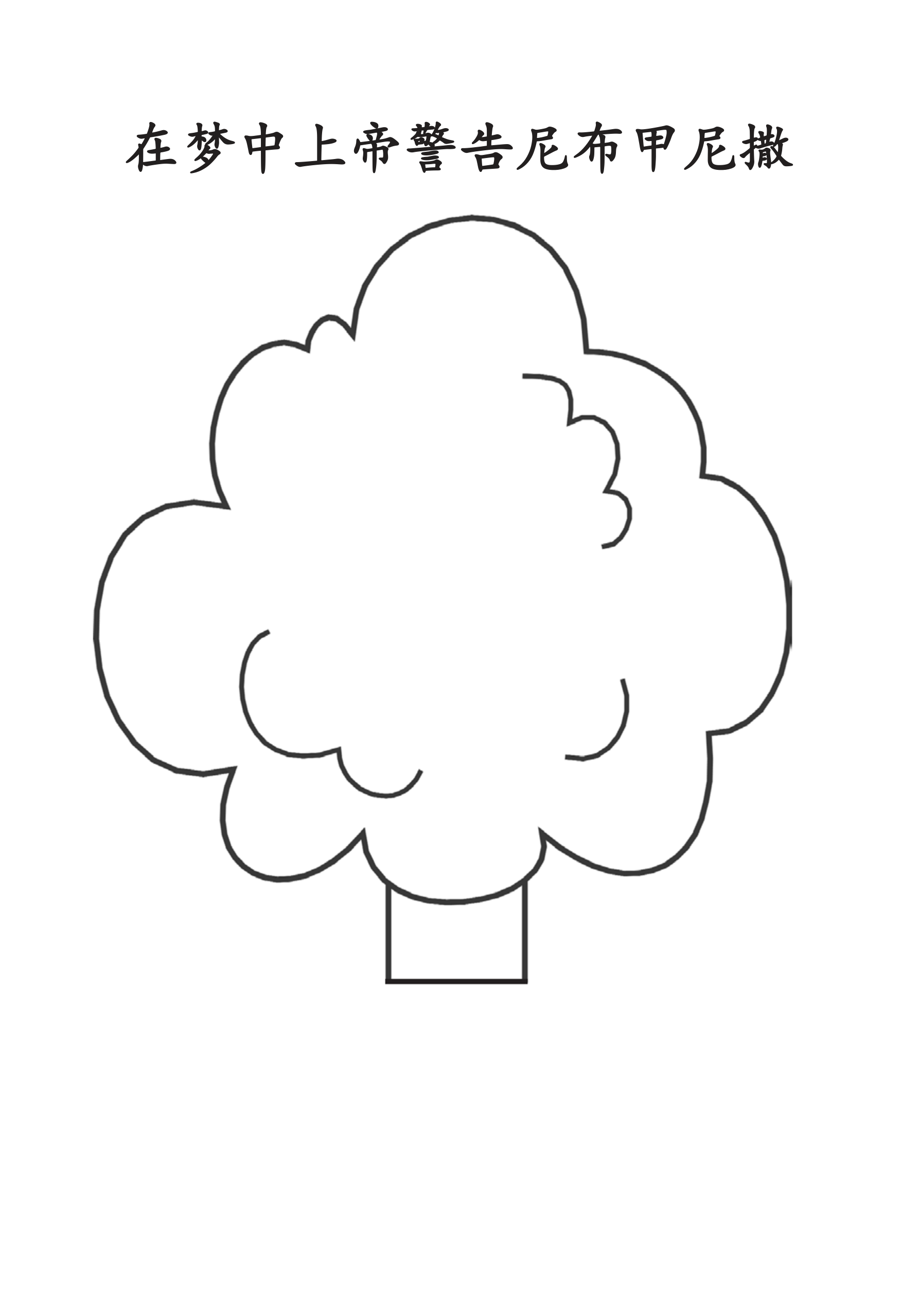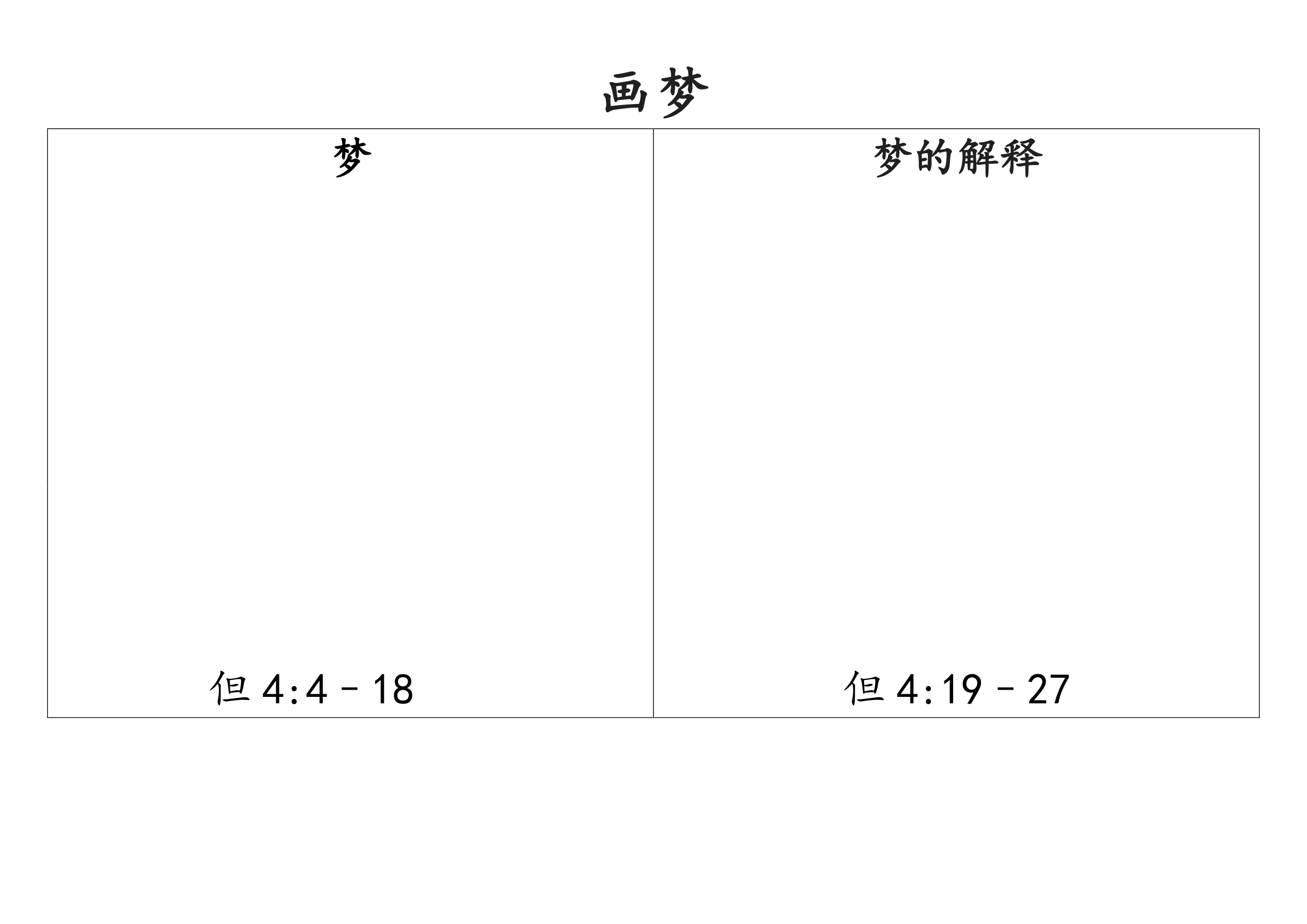 课堂说明:给每个学生发“画梦”的手工页。读《但以理书》4章4节至18节。让孩子们用大脑风暴的方法,在手工页的右边画出尼布尼甲撒的梦。鼓励孩子们根据经文中的描述创作他们自己的大树。再读一下《但以理书》4章19节至27节对王梦的解释,让孩子们思考尼布尼甲撒受到的惩罚可以用什么符号来表示,可以把那些符号画在手工页的左边。