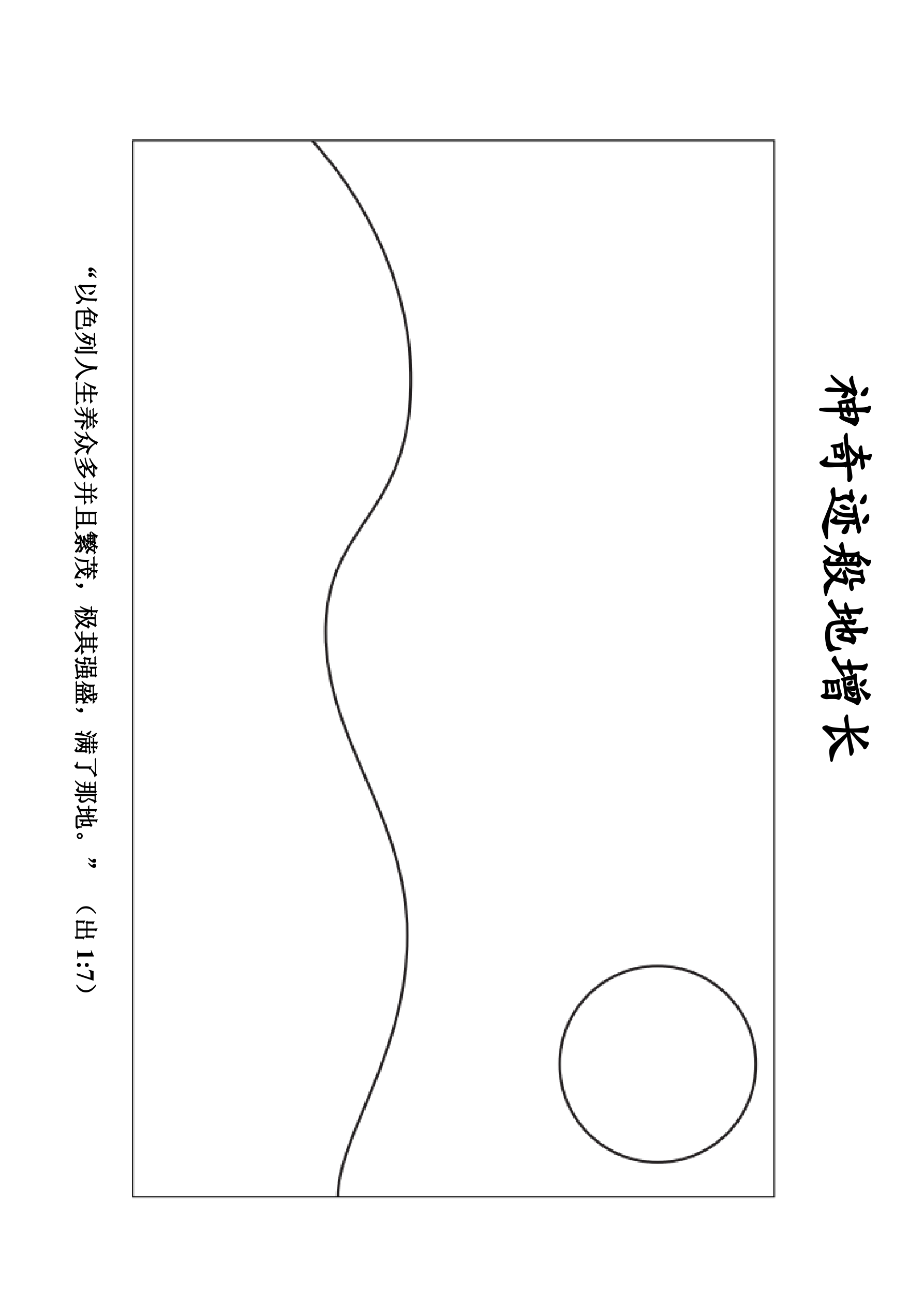 说明:课前,将棕褐色的图画纸剪成山丘状的风景小纸片,将黄色的图画纸剪成圆形当做太阳。课上,让孩子们将棕褐色的山状纸片粘到写着“神奇迹般地增长”的纸的下半部分当作风景。注意不要盖住下方的关键经文。然后让孩子们将大拇指按入印台中并在刚做好的“土地”上按满手印,当“土地”上充满了孩子们的拇指印后,让孩子们把小“太阳”贴在页面上方。最后,孩子们可以在所有的拇指印上画脸。在这个活动中,告诉孩子们上帝是如何帮助以色列民从一个家族成长为一个国家的。