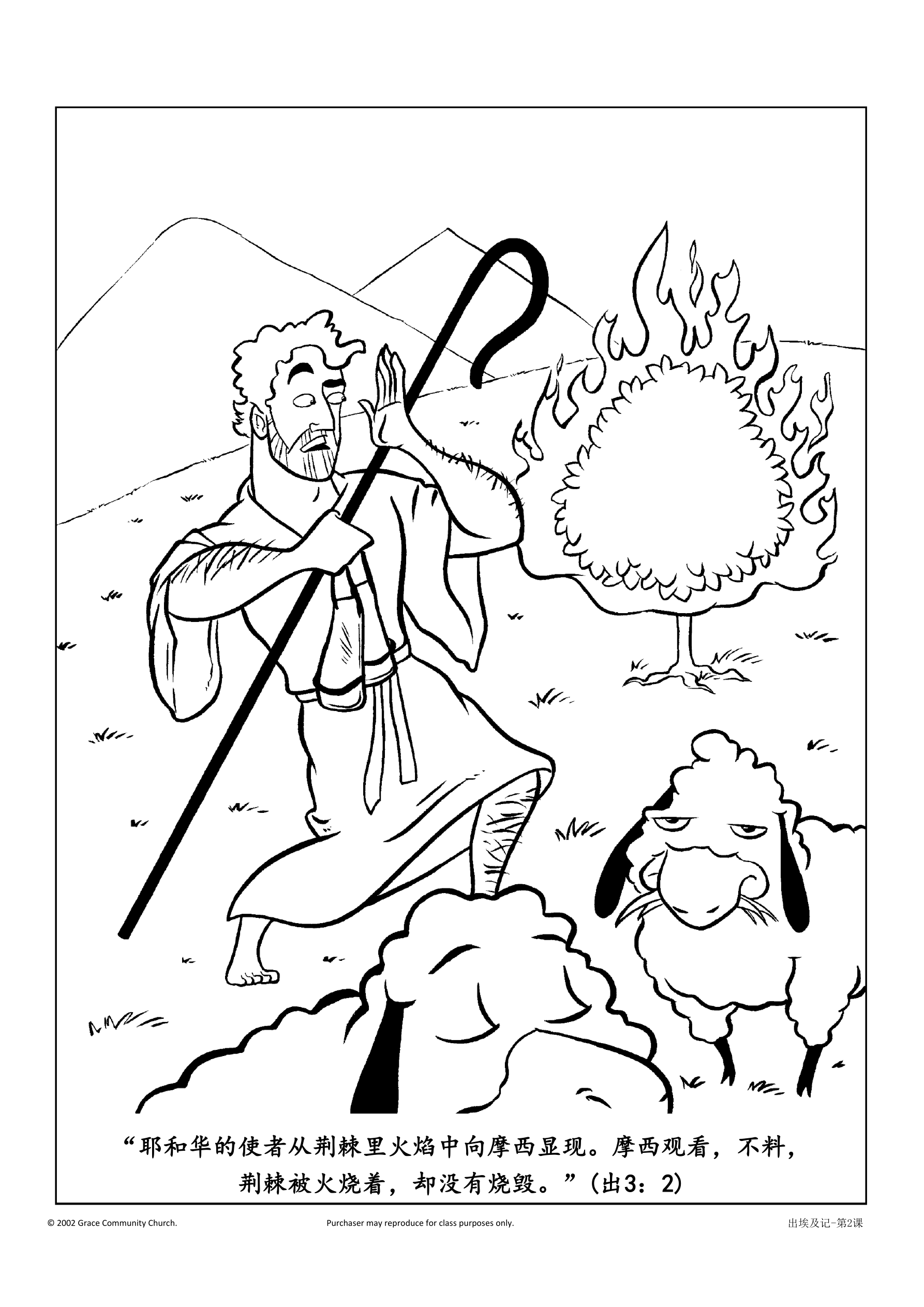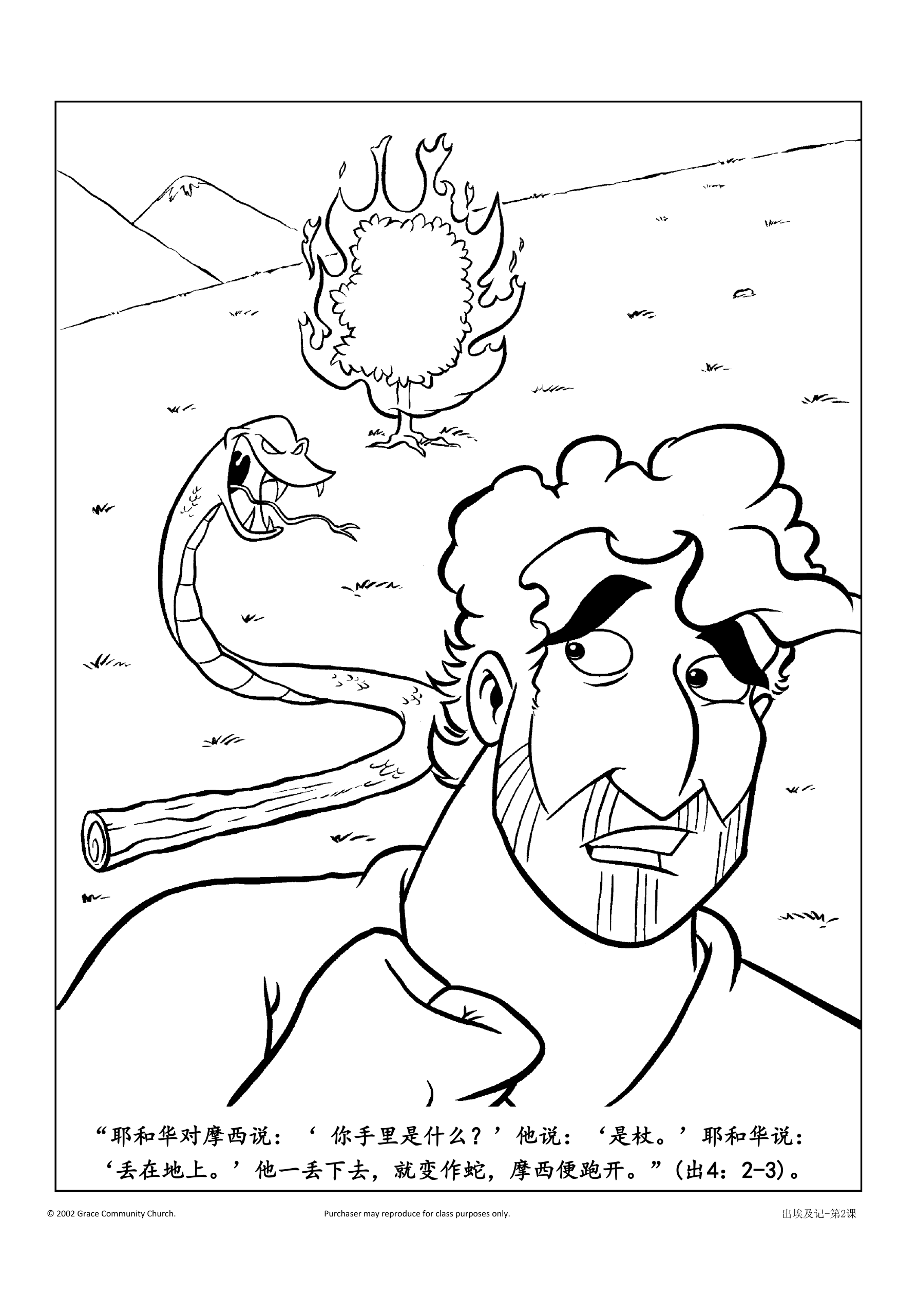 让孩子们撕出橘黄色和金色的火焰,并将其贴在本课后面的涂色单上的荆棘丛中。讨论上帝在荆棘丛中和摩西说了什么。