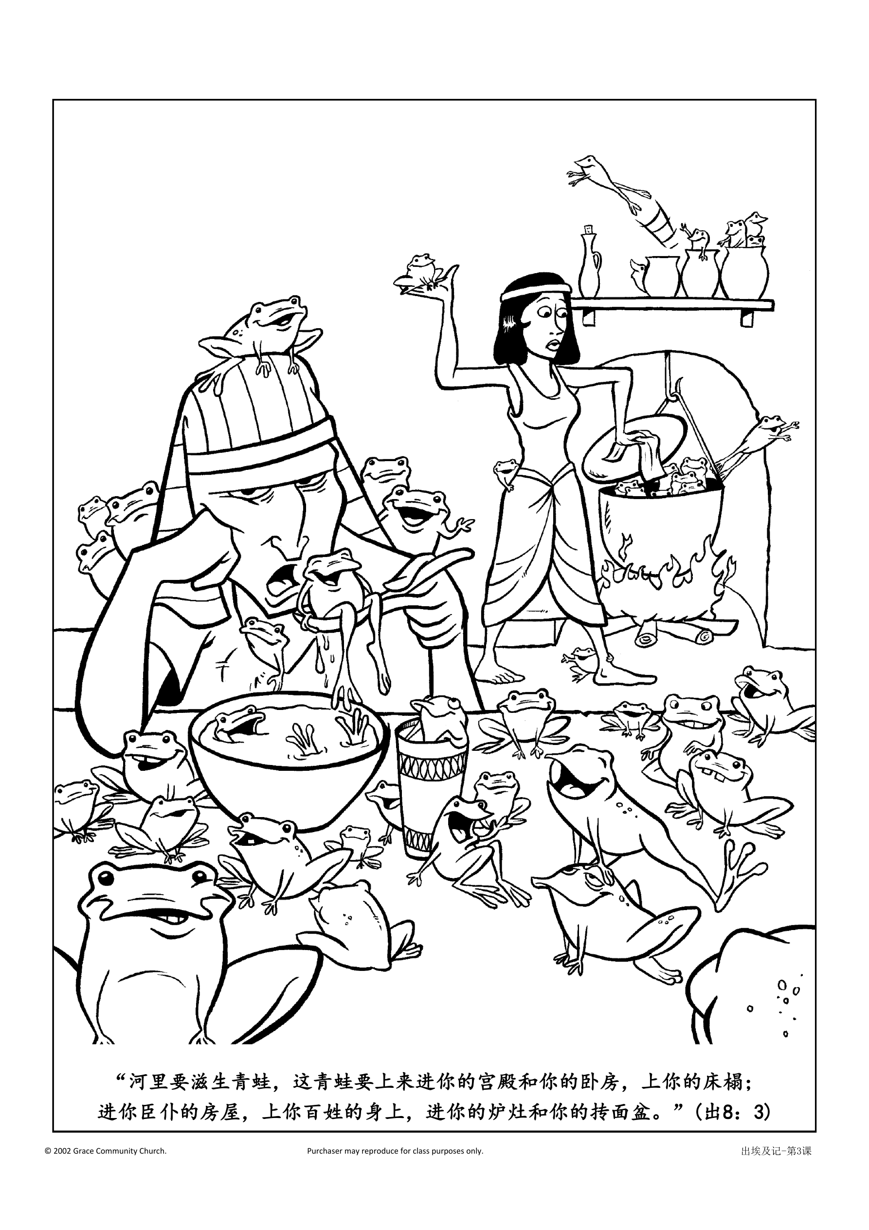 让孩子们围坐一圈,一个接一个传着玩具青蛙或者纸青蛙。老师说“停”的时候,青蛙传到谁的手里谁就要说出课上学的埃及的十灾之一。将代表十个灾难的图片展示出来以便于孩子们记住所学的内容。