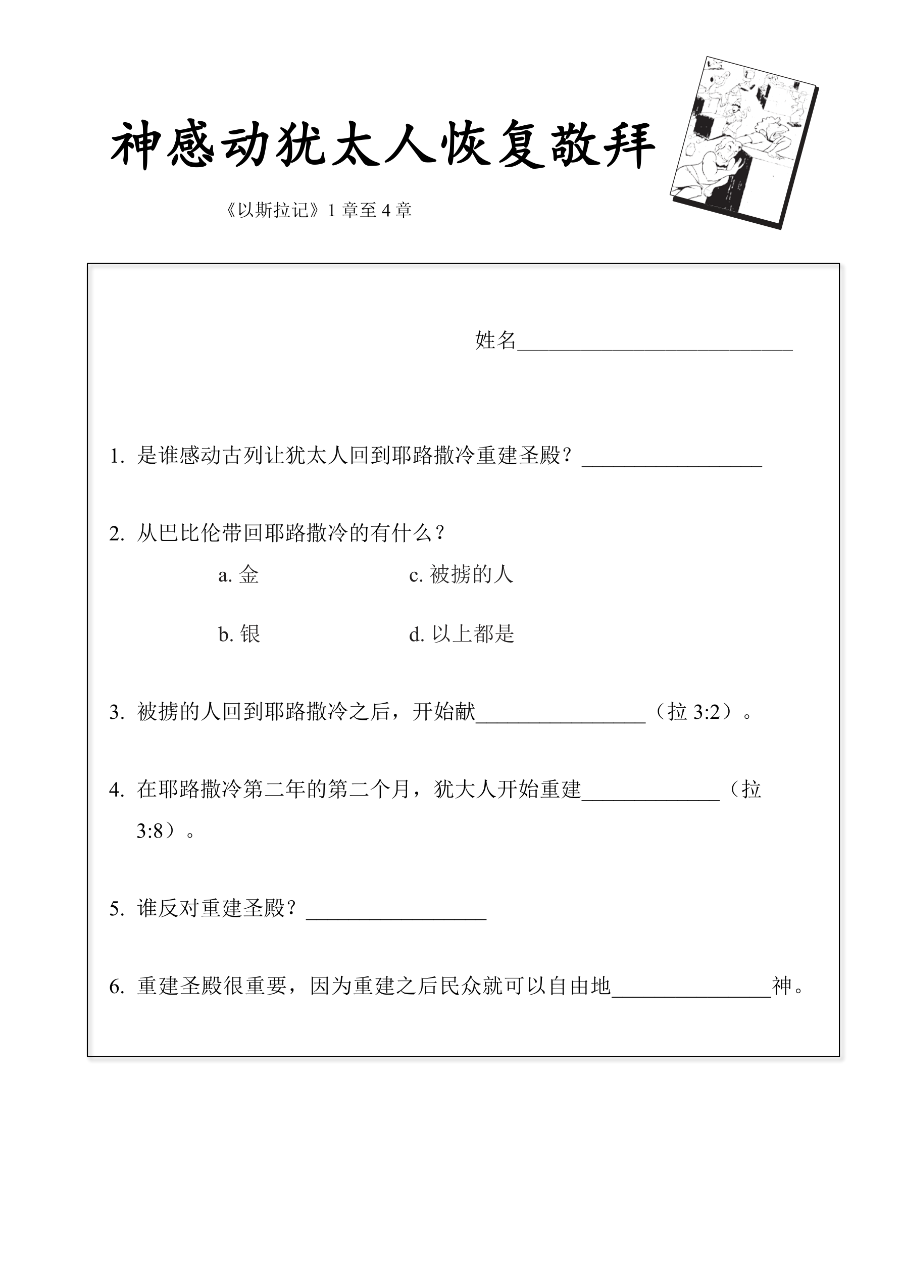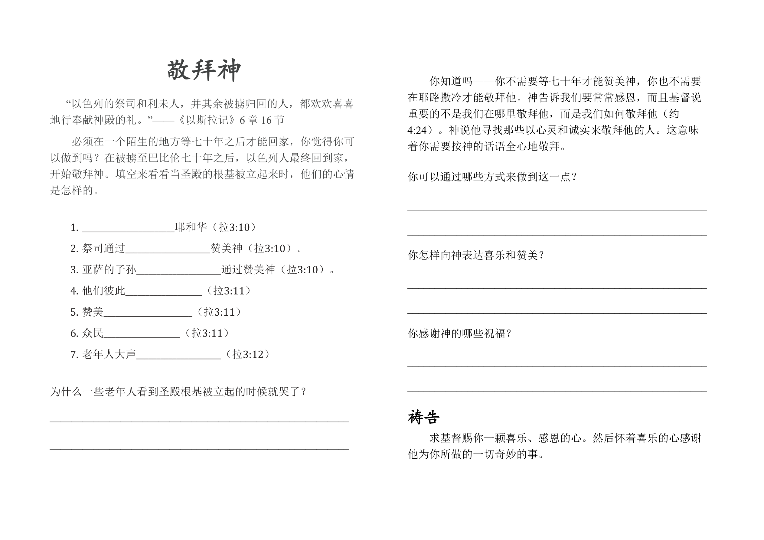 《以斯拉记》告诉我们,在圣殿中祭司、利未人、唱歌的、守门的和殿役是如何服侍和敬拜神的。这些人做了哪些服事神的工作?在基督的身体里,我们都有要尽的职责和要做的工作。神已经赐给我们恩赐和能力来完成他为我们预备的工作。学生可以做哪些工作来服侍神呢?什么工作是学生们长大成人之后可以做的呢?