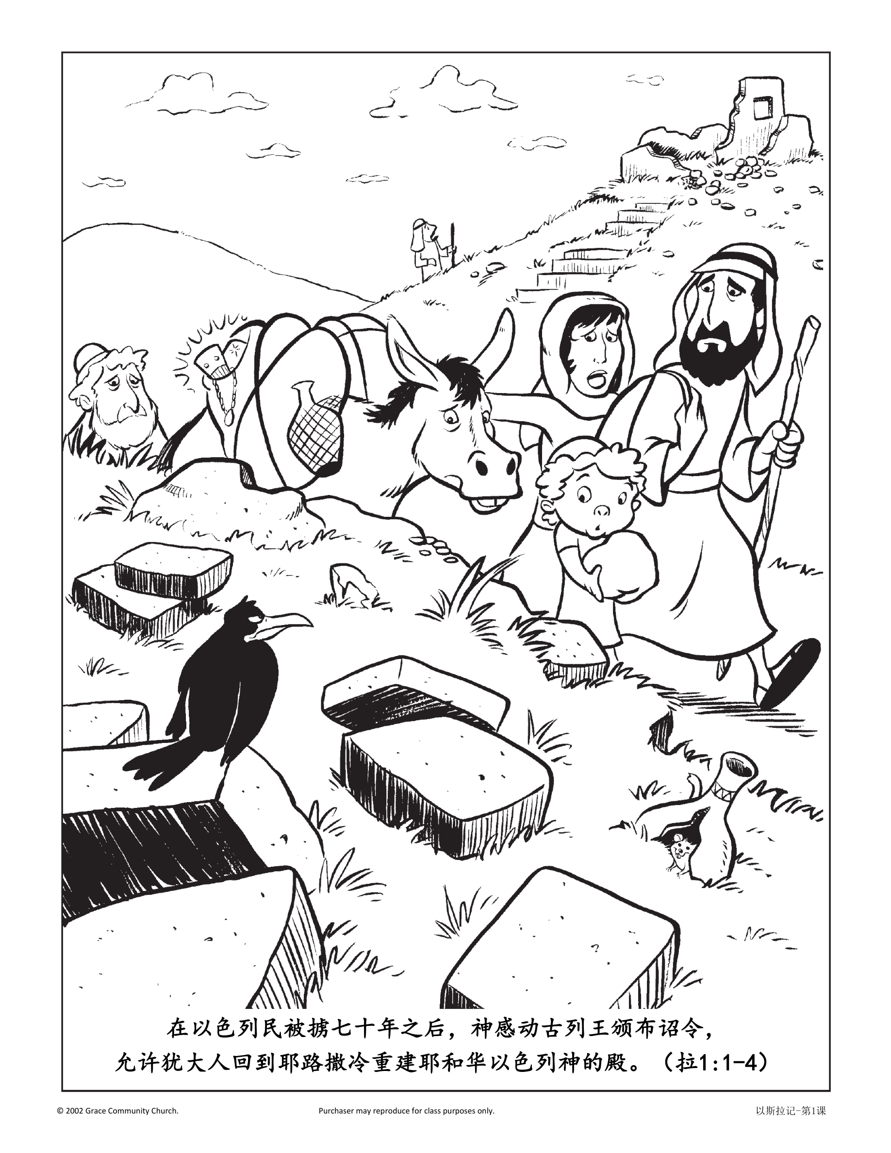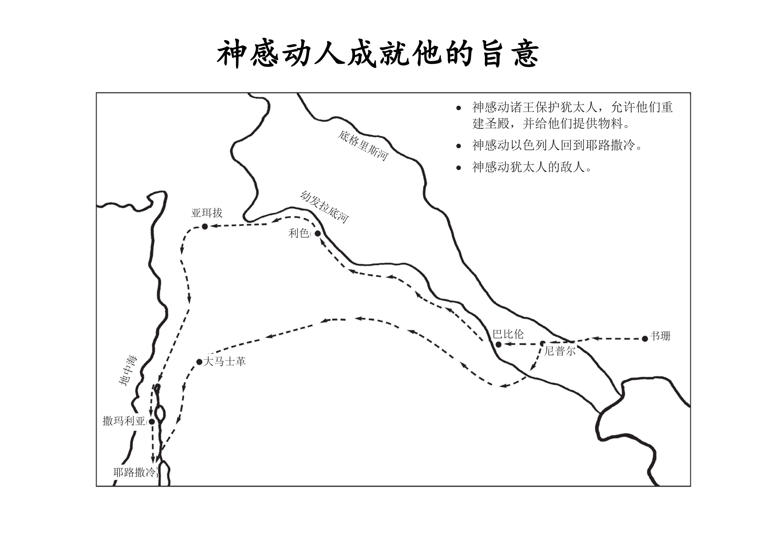 《以斯拉记》第2章是上帝应许带犹太人返回耶路撒冷信实的见证。为了让这样充满祝福的经历对孩子们来说更生动,可以让他们想象重回耶路撒冷是什么样的景象。课前准备好一张画卷,在顶部写好《以斯拉记》21节的经文。每当一个孩子进入教室,可以让另一个老师或者课堂助手把学生叫到旁边,然后读画卷顶端写的字。告诉学生假装他们每一个人都是上帝应许返回圣城的子民,在经文下面写下他们的名字。每进来一个孩子,就解释经文并在上一个孩子下面写下他的名字。(你可以找一名教会成员来教室,并用书法写下孩子的姓名。准备的画卷越漂亮,孩子越会喜欢这个活动。)在课前,读整个画卷并告诉孩子们,在今天的圣经课程里他们将会学到上帝是何等地有恩典,允许在这样的名单上记录下他的话语。