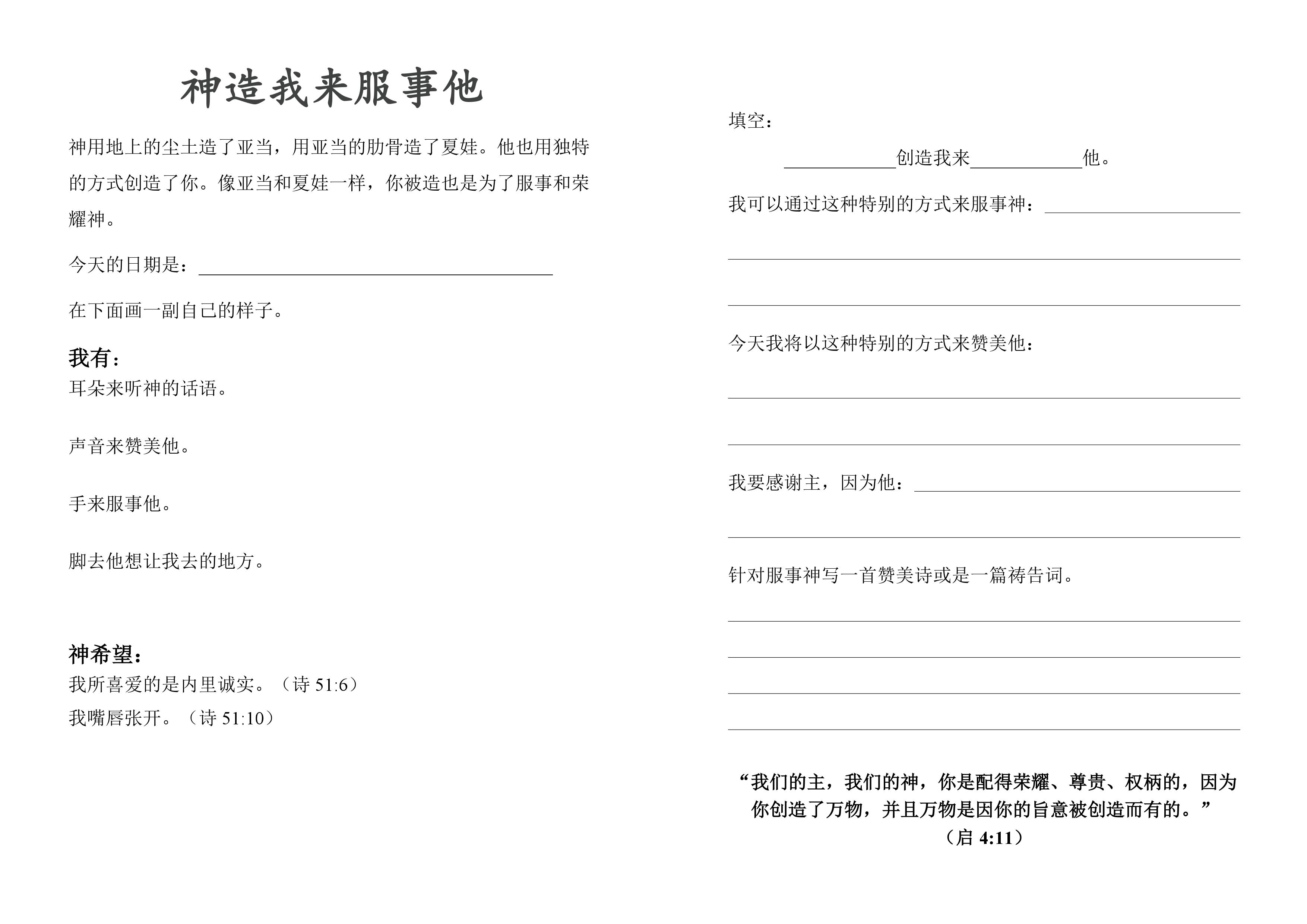 在上一周的课程中,我们学到了宇宙是怎么造成的,神创造了宇宙。本周我们特别学习了男人和女人是怎样造成的。我们也学到了他们被造的原因。男人受造是为了管理神在地上的创造物。神要他做地上的好管家。但是他这样做并不是为他自己,而是为神照管受造物,因为神创造了他来做这份工作。这引导我们想出我们被造的另一个重要目的——服侍并顺服神。