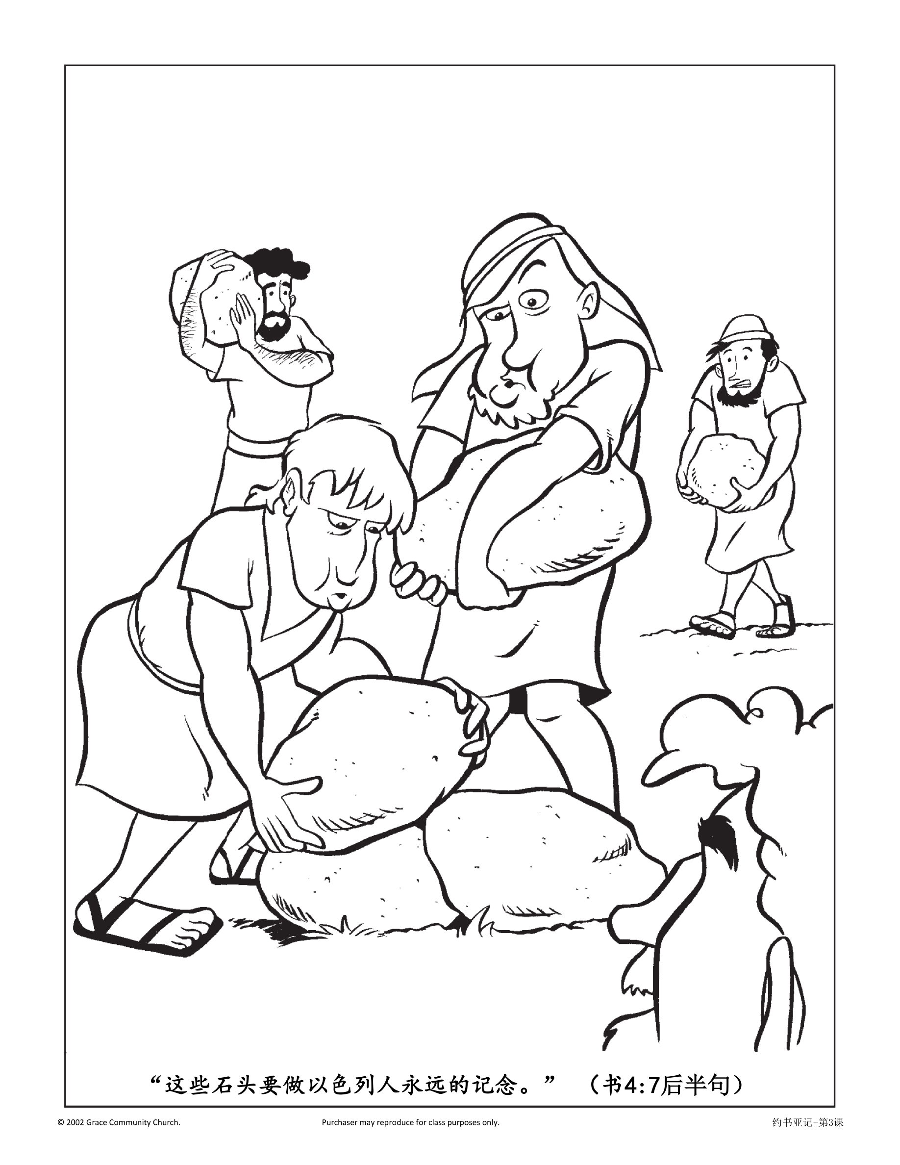 耶和华先前吩咐约书亚在以色列十二支派中各拣选一人(书3:12)。如今,神显明他要这些人做什么:他们要从祭司脚站定的地方各取一块石头(书4:2-3)。神吩咐他们将河床的石头扛在肩头,直到前方的营地(书4:8)。这些石头要做以色列人的记念,提醒他们神如何为他们断绝约旦河的水(书4:7)。
