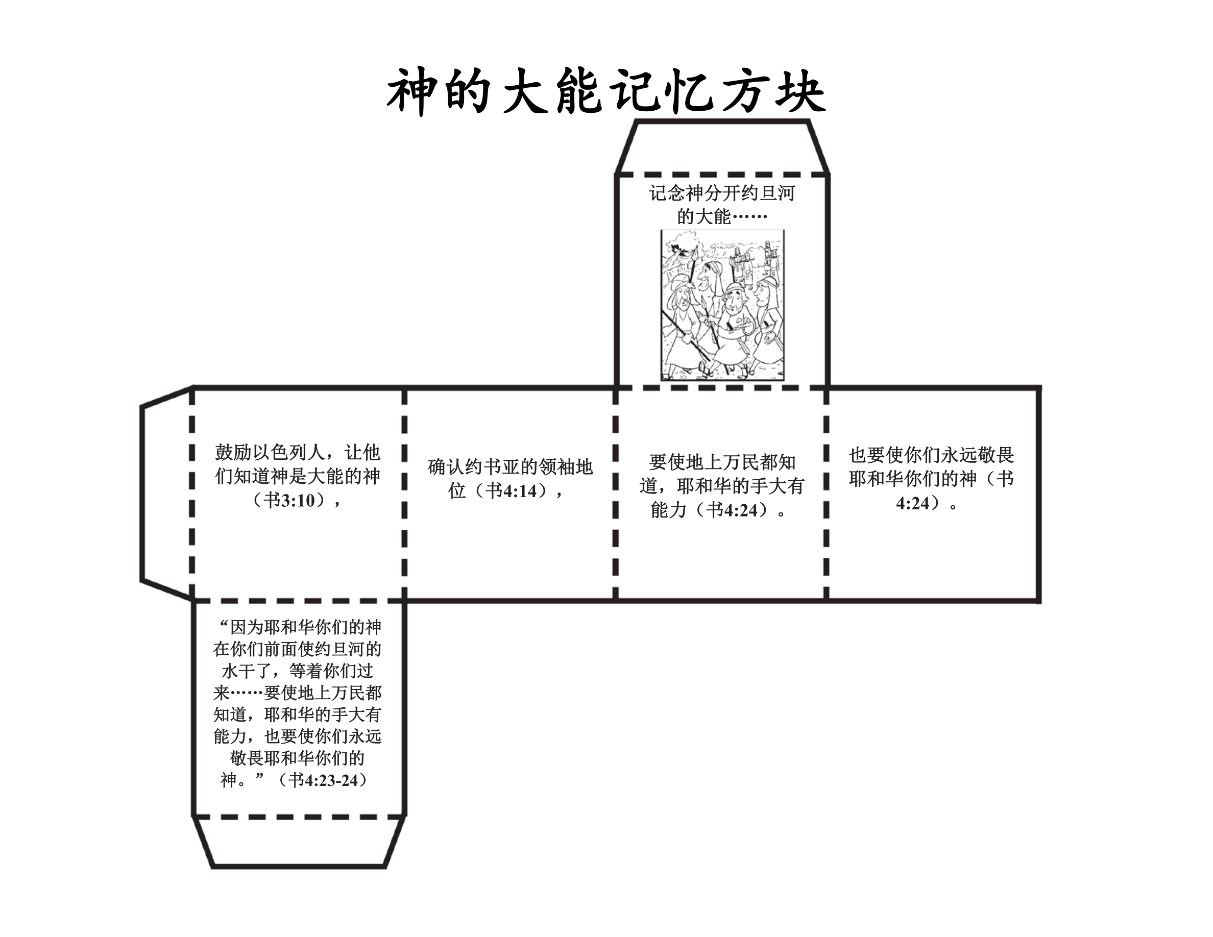 课堂说明:按手工页上的形状对其裁剪,沿虚线折成一个盒子,用胶水将盒子的底面和侧面固定。上面要像个盖子一样可以打开可以合上。盒子制作完成后把小石头放在盒子里面。和孩子们讨论以色列人从约旦河里取的石头,这些石头是为了纪念《约书亚书》3章至4章以色列人过约旦河的事件。