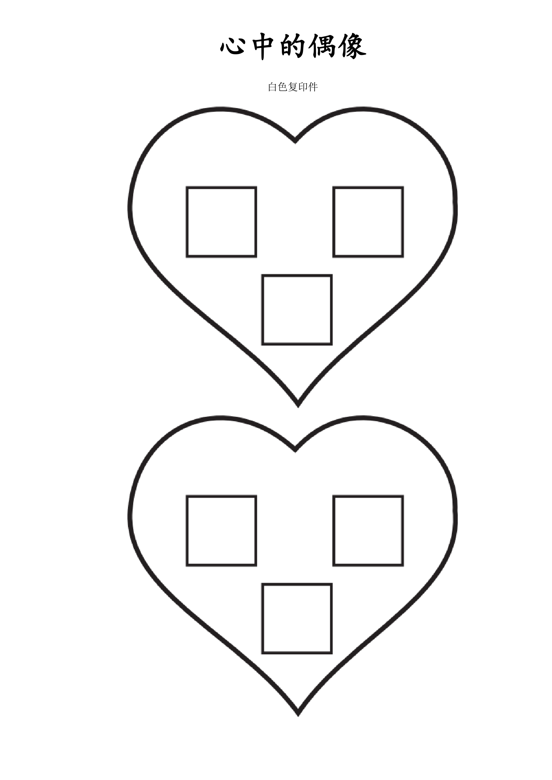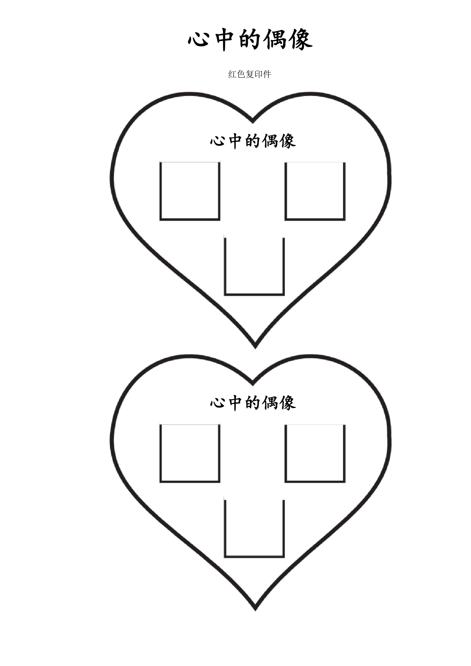 课堂说明:指导学生把白色的心沿着外边缘线剪出来。在五个方格内,孩子们写一个词或者画一幅画象征在他们心中隐藏的偶像,他们须努力保守自己的心远离这个偶像。回顾一下在课前大家头脑风暴后写在白板上的偶像列表。指导学生从列表中选出那些他们内心纠结最多的偶像。孩子们完成填充盒子后,指导他们沿着外边缘线把红色的心形剪出来。接下来,给孩子们示范如何沿着底部和边缘剪出五个侧翼。顶端的翼必须是连接着的,这样可以随时掀开看到在心中隐藏的偶像。指导学生把红色心形的后面涂上胶水,并且粘在白色心的顶端,在红心上将侧翼依次排开,而方块留在白色心上。最后,让孩子们重要经文《列王纪上》11章4节写在白色心的后面。