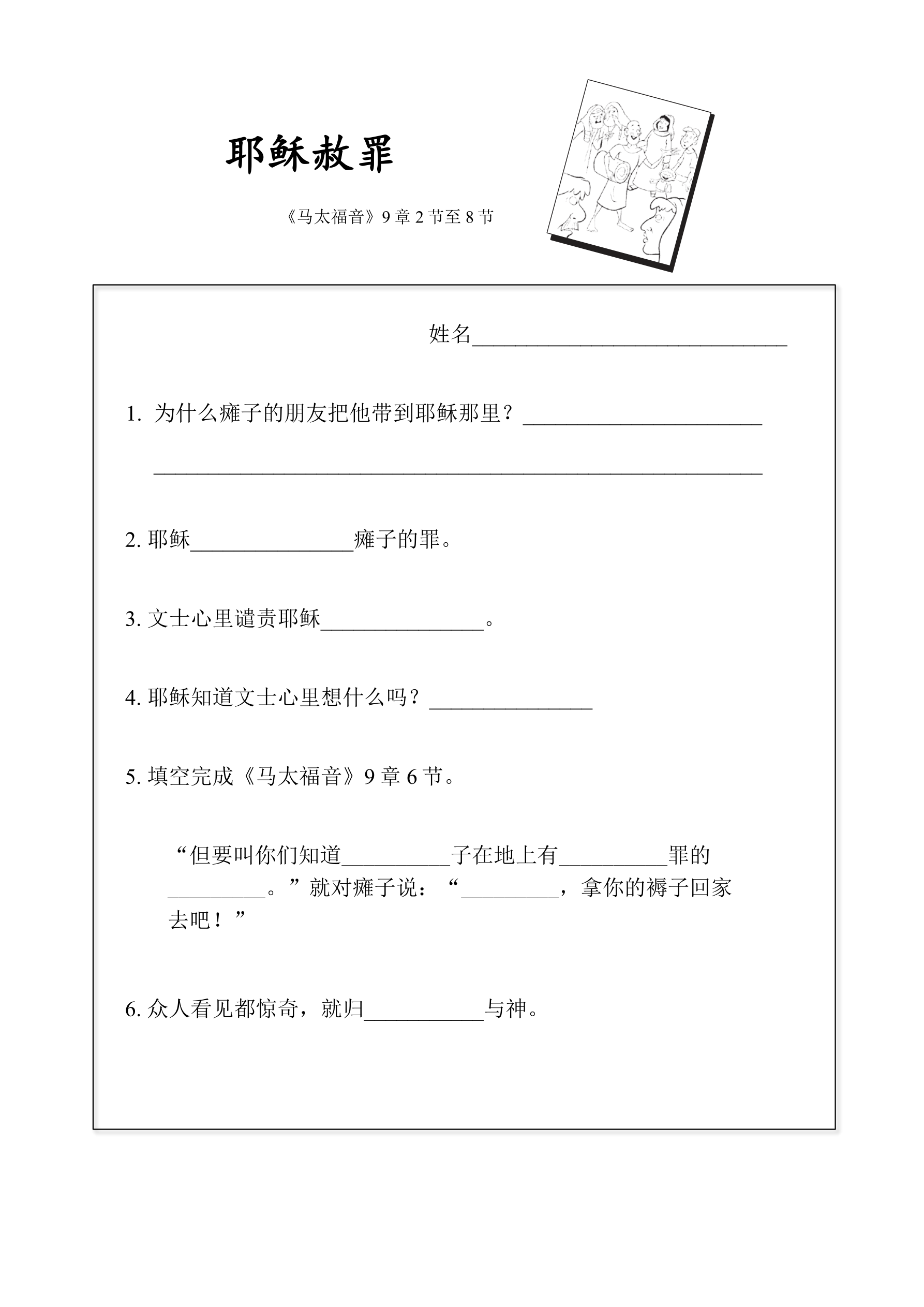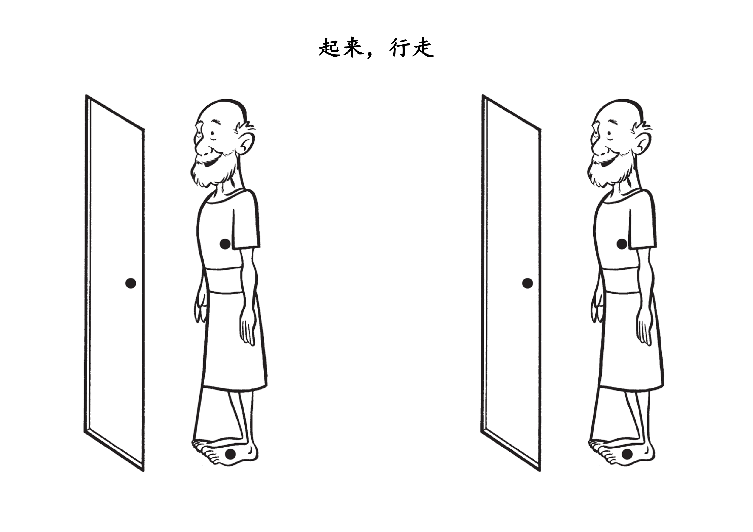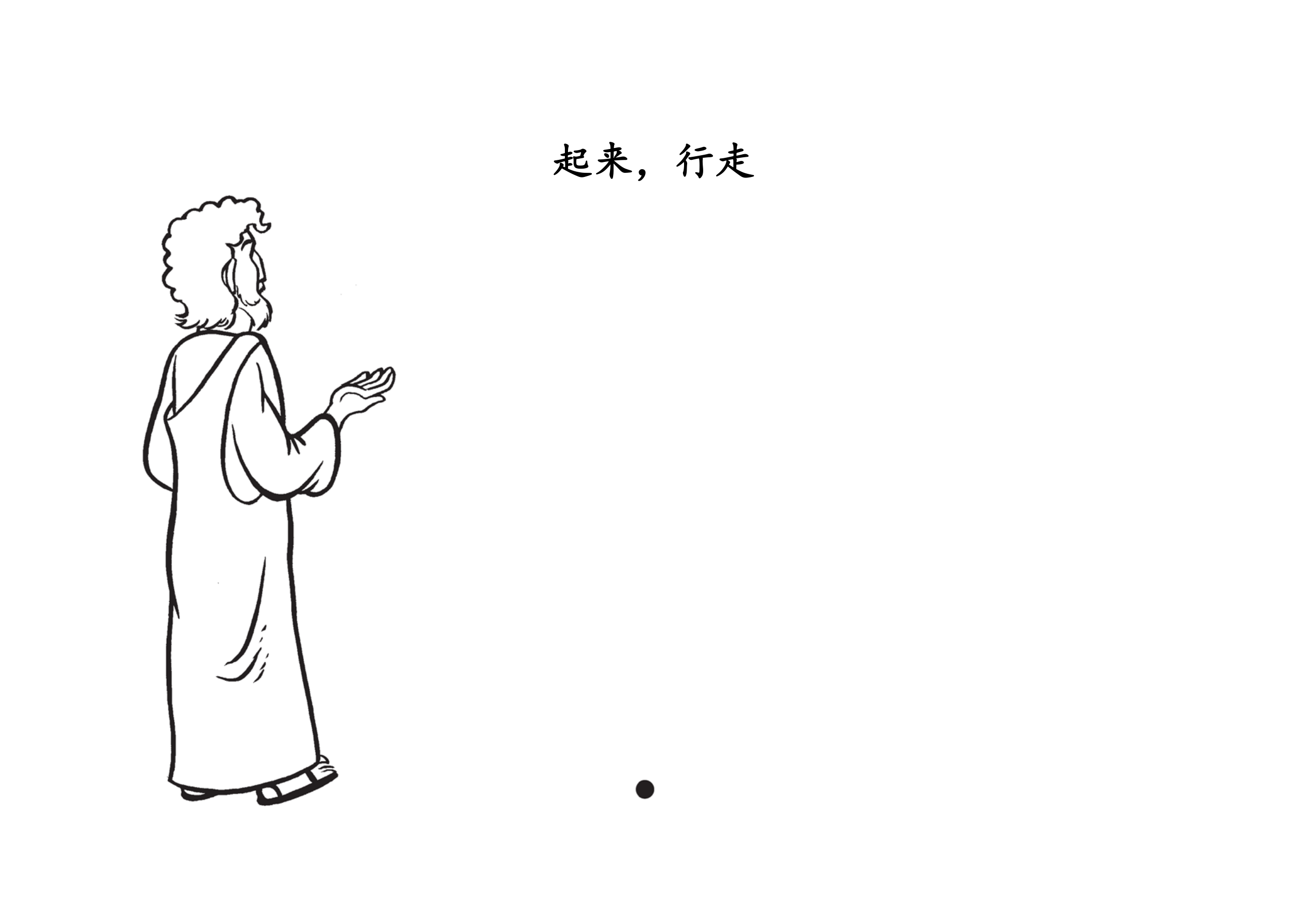 说明:给每位学生一张纸,孩子们可以根据自己想象出来的故事情节将这张纸上色作为背景,然后剪下瘫子和他的褥子。将一个无头钉穿过瘫子和背景纸(在瘫子脚上),这样他既可以躺着也可以站起来。然后将另一个无头钉穿进瘫子的肩膀和褥子上的黑点,但是不要和背景纸连在一起。这样瘫子起来行走的时候,褥子看起来像是夹在他的胳膊下。
