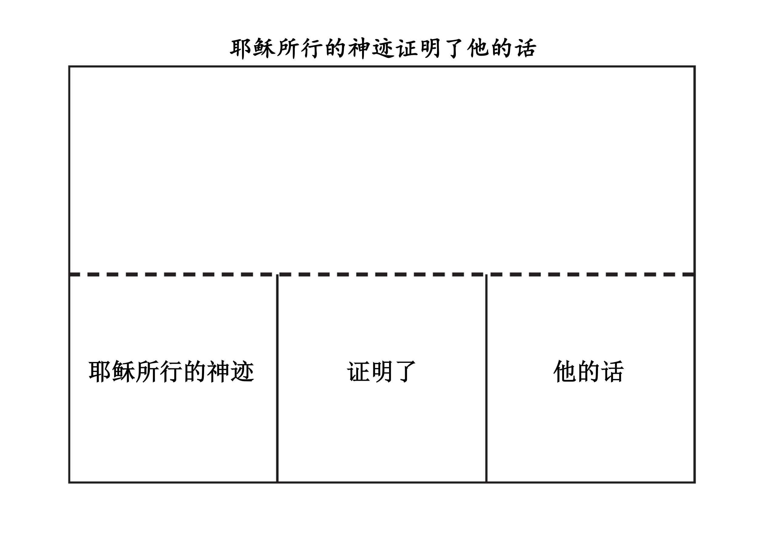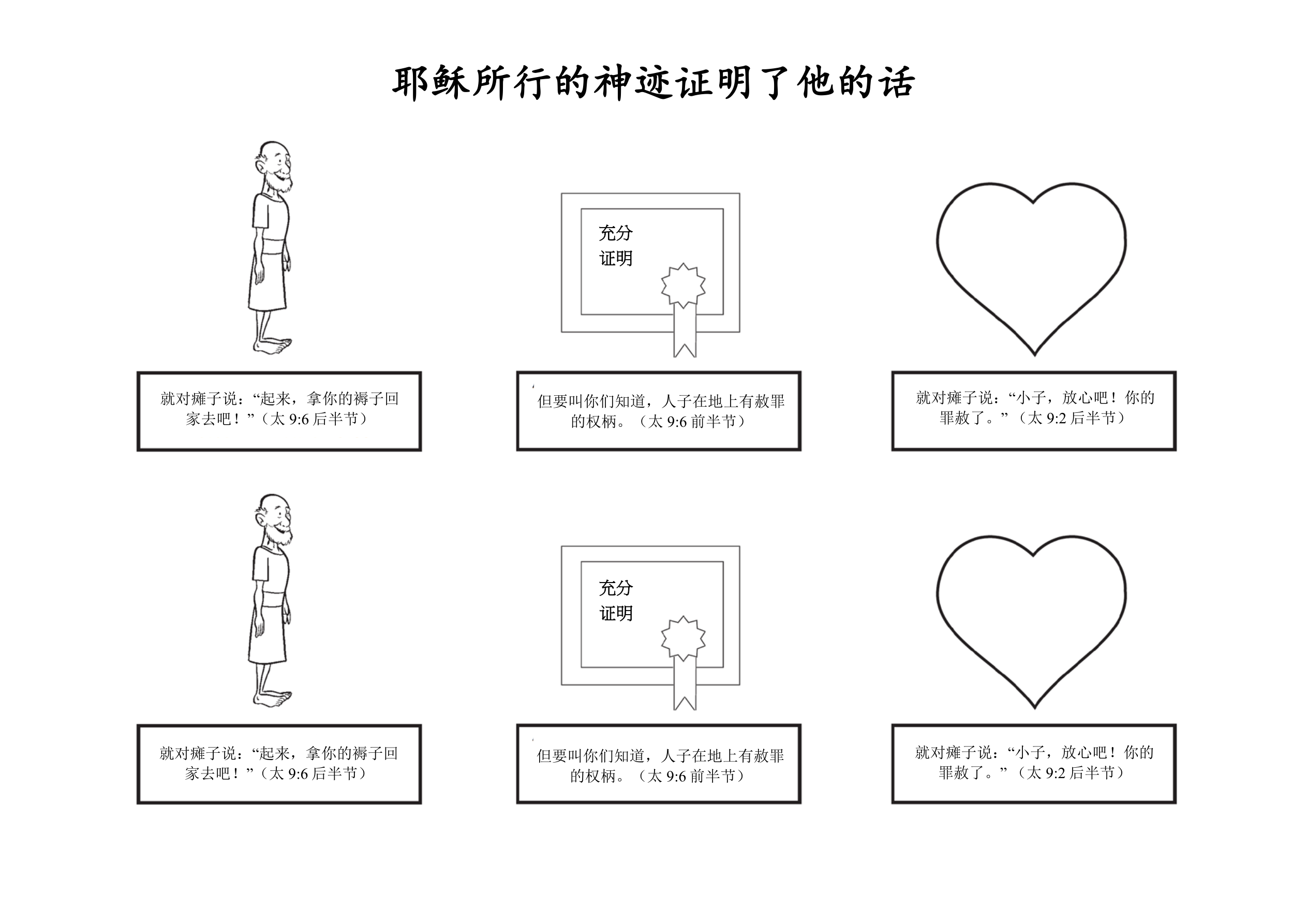 说明:沿实线剪下第一张手工页上的形状,并沿虚线将其对折,让上面的话显示在前面。完成后可以看见三个写有文字的方格。然后在第二张手工页上剪下图片和经文,并将其贴在相应的方格上。也可以不将瘫子的图片贴在方格上,而是用一个无头钉固定,这样他可以躺下也可以站起来。和孩子们解释一下耶稣所行的神迹如何证明他就是真神。