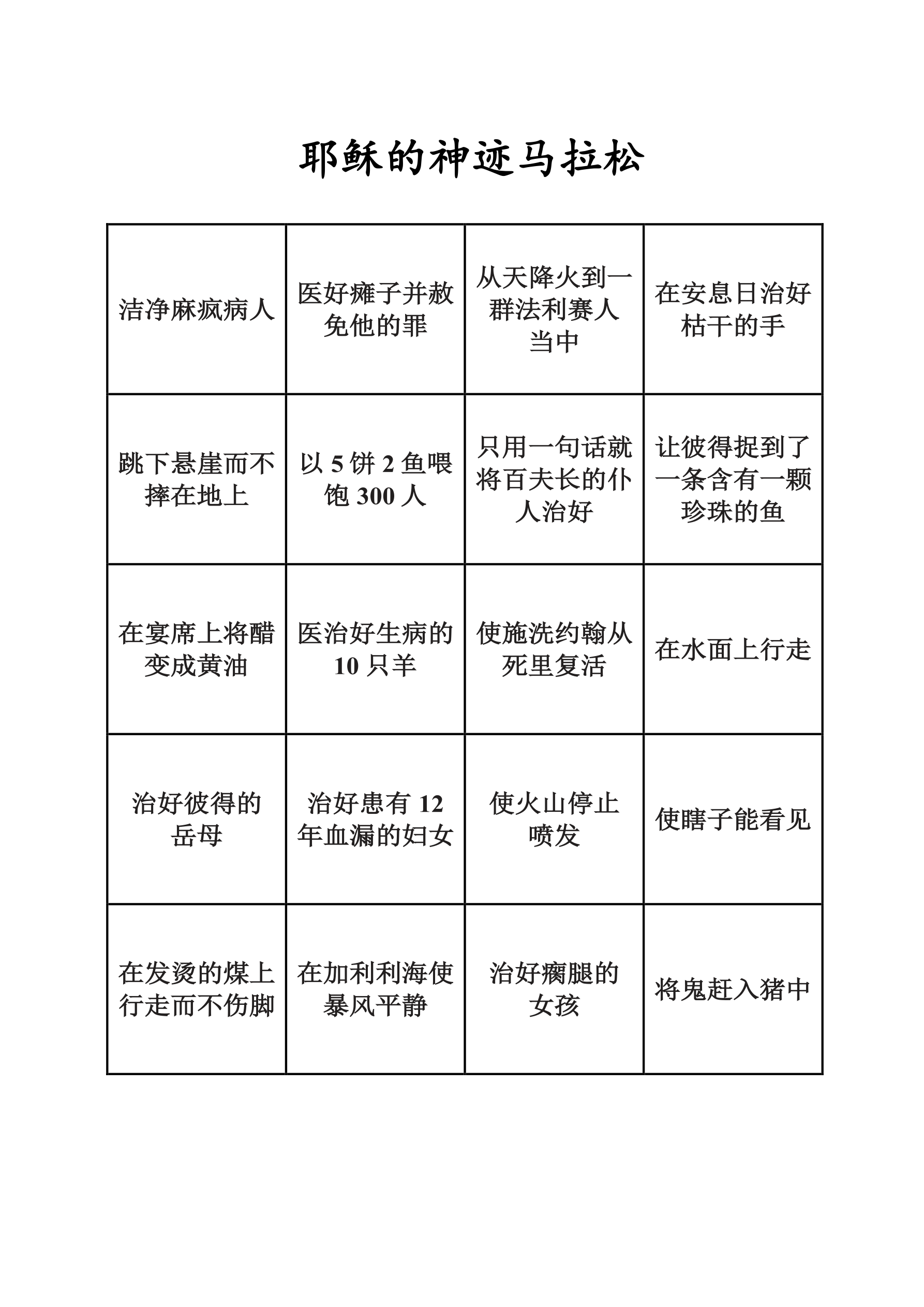 说明:将孩子们分组,并指导他们在起点线后面排好队。游戏规则如下:每队的第一个学生跑到游戏纸板前,阅读神迹描述,将圣经中没有记载的神迹卡片翻过去背面朝上(他觉得是耶稣行的神迹就不要翻过去),然后跑回队伍的起跑线。接下来助教去检查答案是否正确。答案全部正确的那一组就是赢家;如果答案有错,那么队伍中的第二个孩子要跑过去进行改正,将游戏板面朝上或者面朝下放着。继续这样的步骤,直到有一组的答案完全正确。