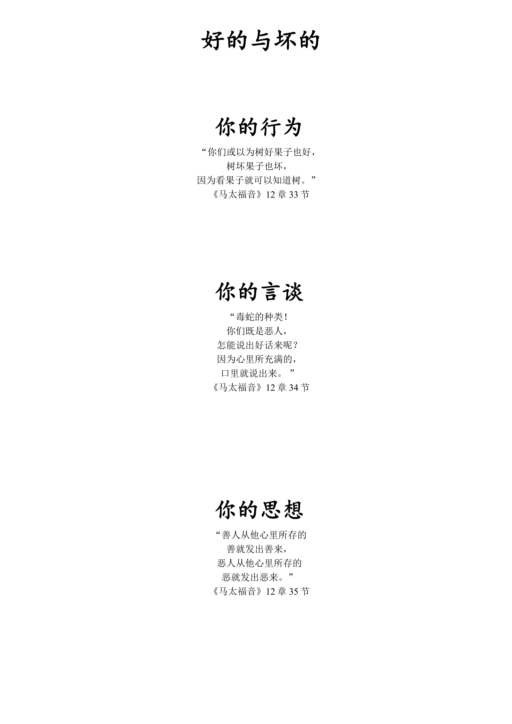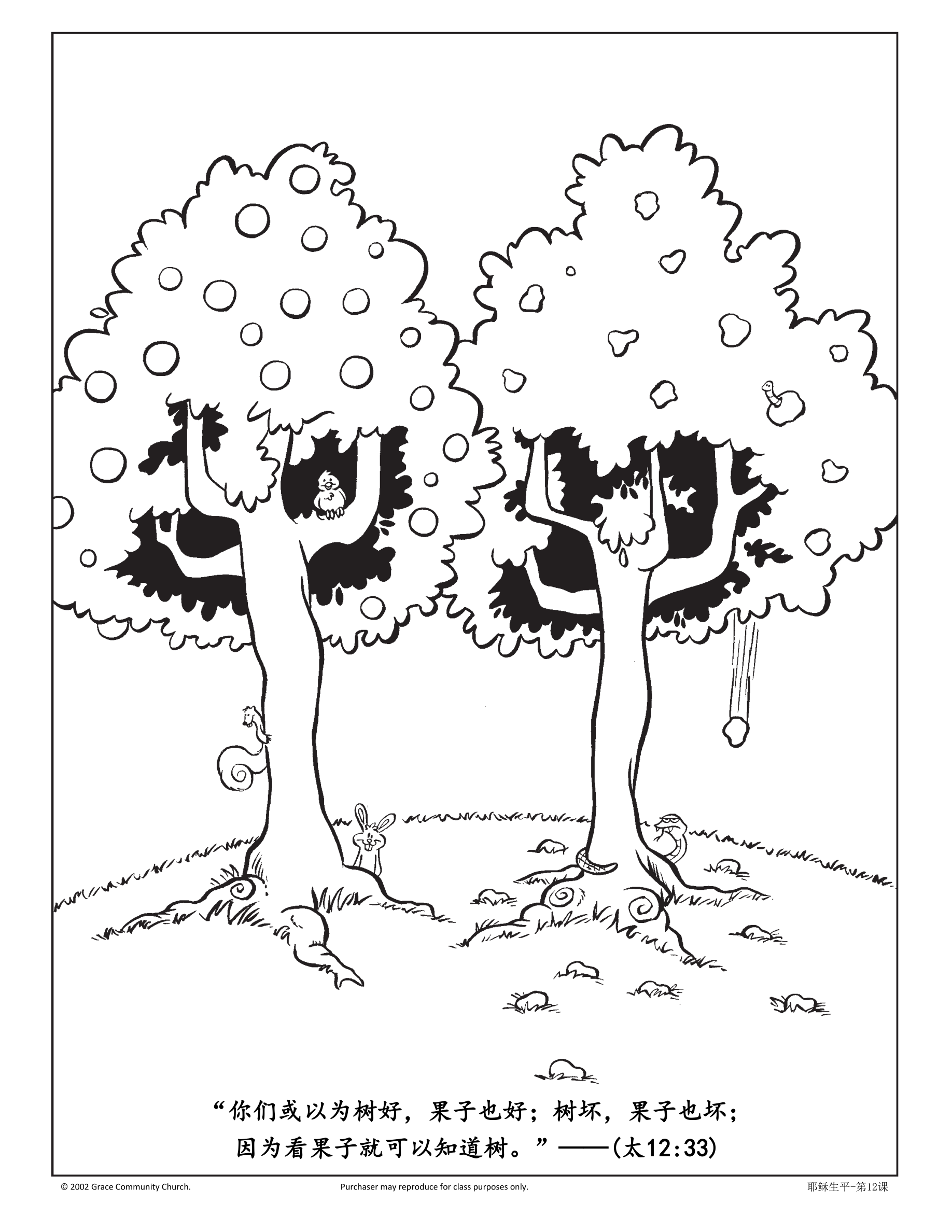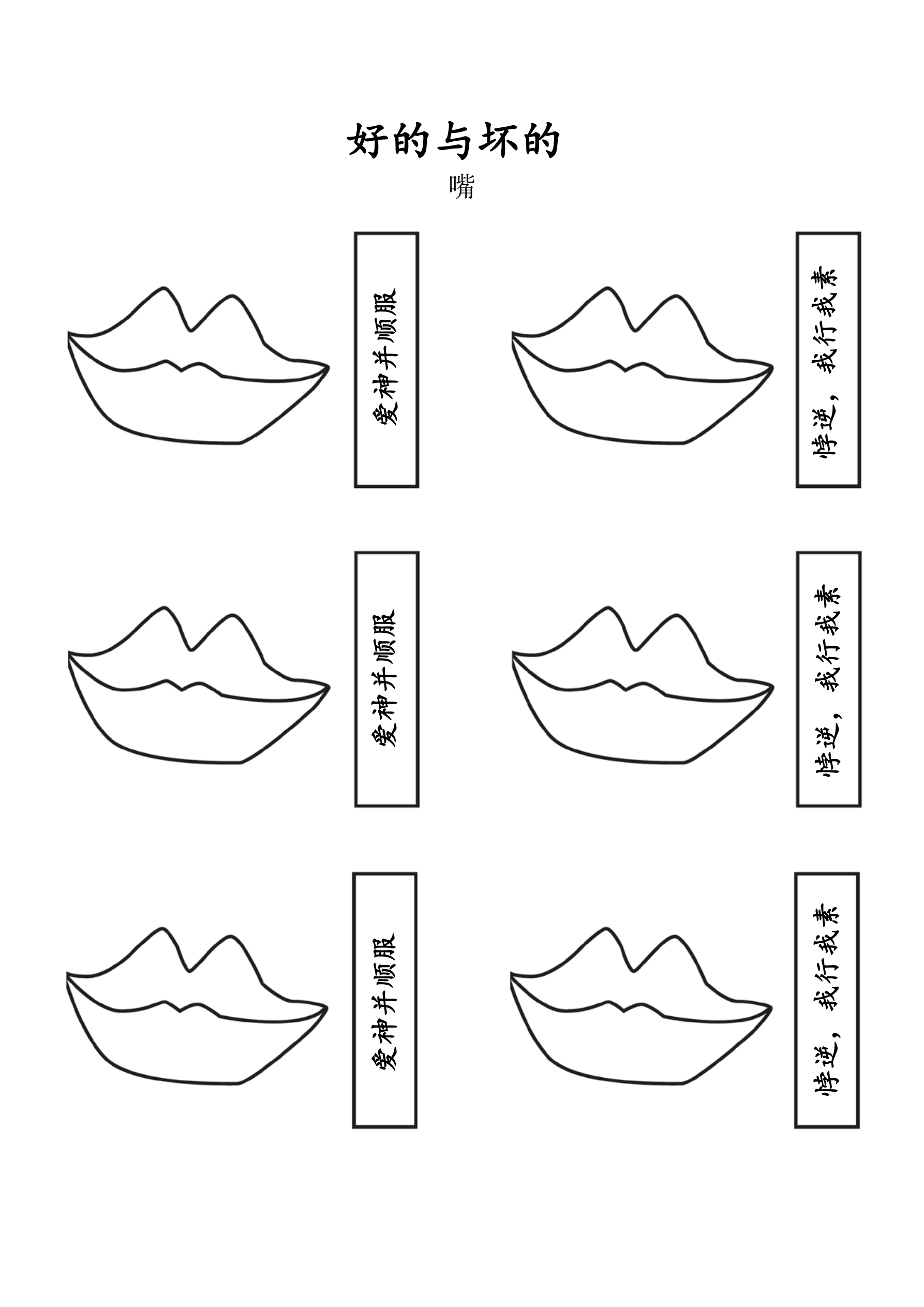 说明:每个学生都应该有一张写有主标题、副标题和经文的底图。把在左边视为好的,在右边视为坏的。将顶部的两棵树分别贴在第一段经文的两边。让孩子们在左边的树上画上好果子,在右边的树上画坏果子。接下来,剪下嘴唇和卡片,在每片嘴唇上切一个裂缝,并将其贴在第二段经文两边,然后将卡片嵌入相应的嘴唇里。最后剪下两个百宝箱并沿虚线折叠,这样百宝箱可以打开或者合上,分别将其贴在第三段经文的两边。将红心贴在“好”(即左边)的那一边百宝箱的中间,黑心贴在“坏”的百宝箱中间。