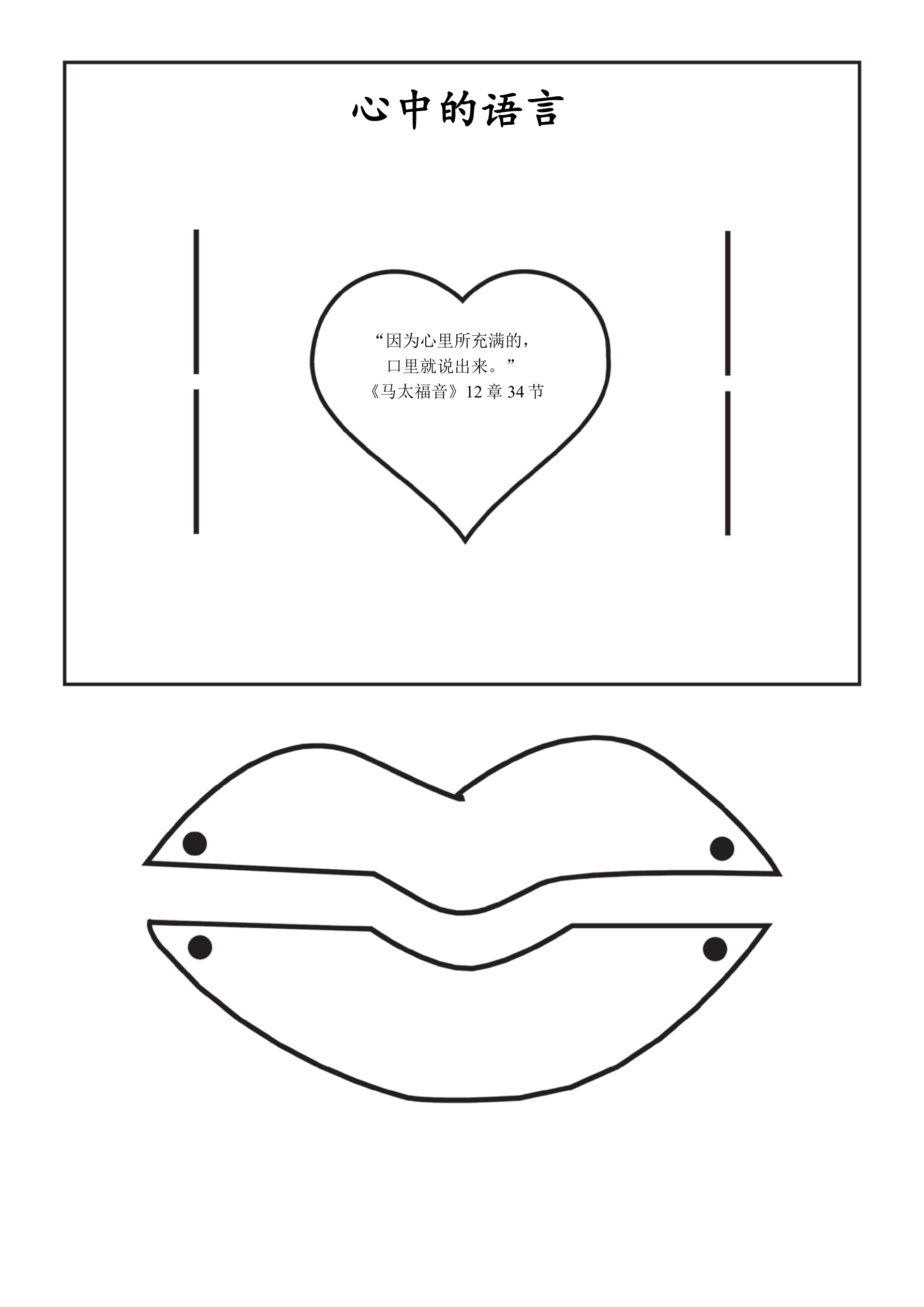 说明:将剪刀和“心的语言”手工页发给学生,指导孩子们将矩形沿着四周剪下,并剪开四条裂缝。然后指导学生把嘴剪下来,并从中间把嘴分开来。给孩子们发无头钉,指导他们将无头钉戳到每个嘴角的小黑点处。在使用无头钉前,先将其放到矩形卡片的四条裂缝内,并滑动使嘴合起来,可以盖住下面的心形,固定无头钉。给孩子们展示如何将上面的两根无头钉向上滑,将下面的两根向下滑以打开嘴,这表明“心里所充满的,口里就说出来”(太2:34)。
