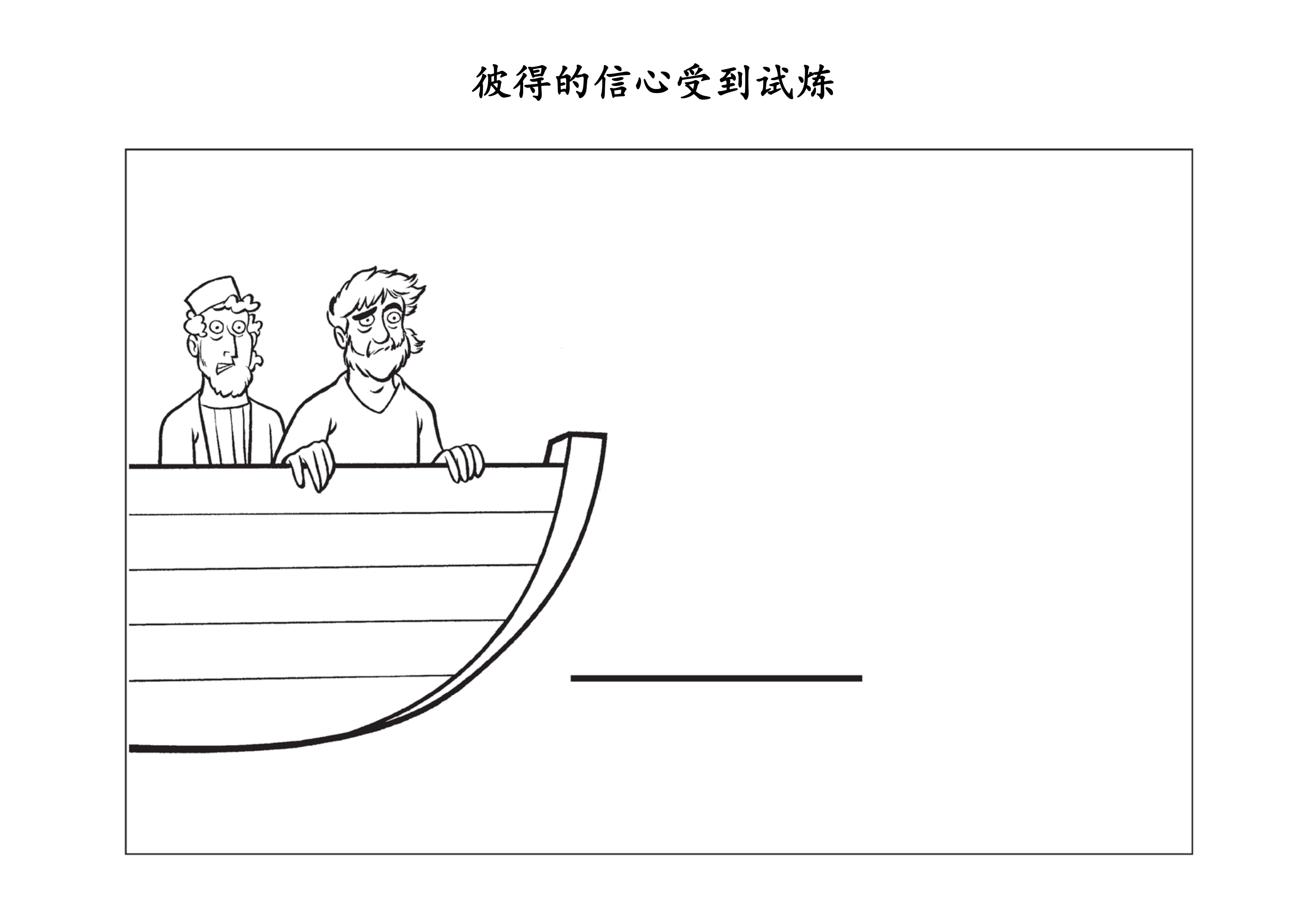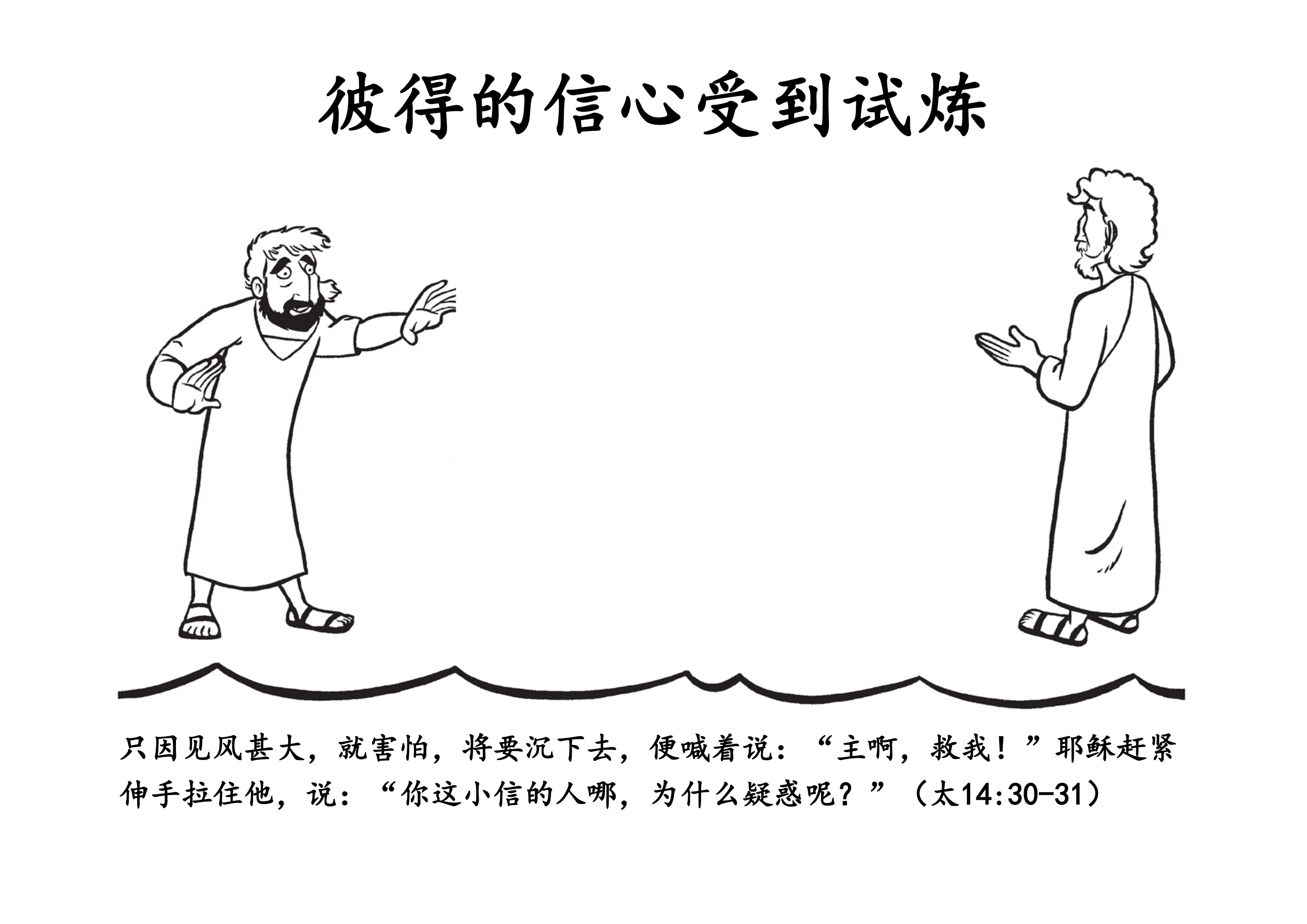 所需材料:彼得、耶稣、门徒、船(1/4个圆)、风浪以及“彼得的信心受到试炼”手工页复印件。