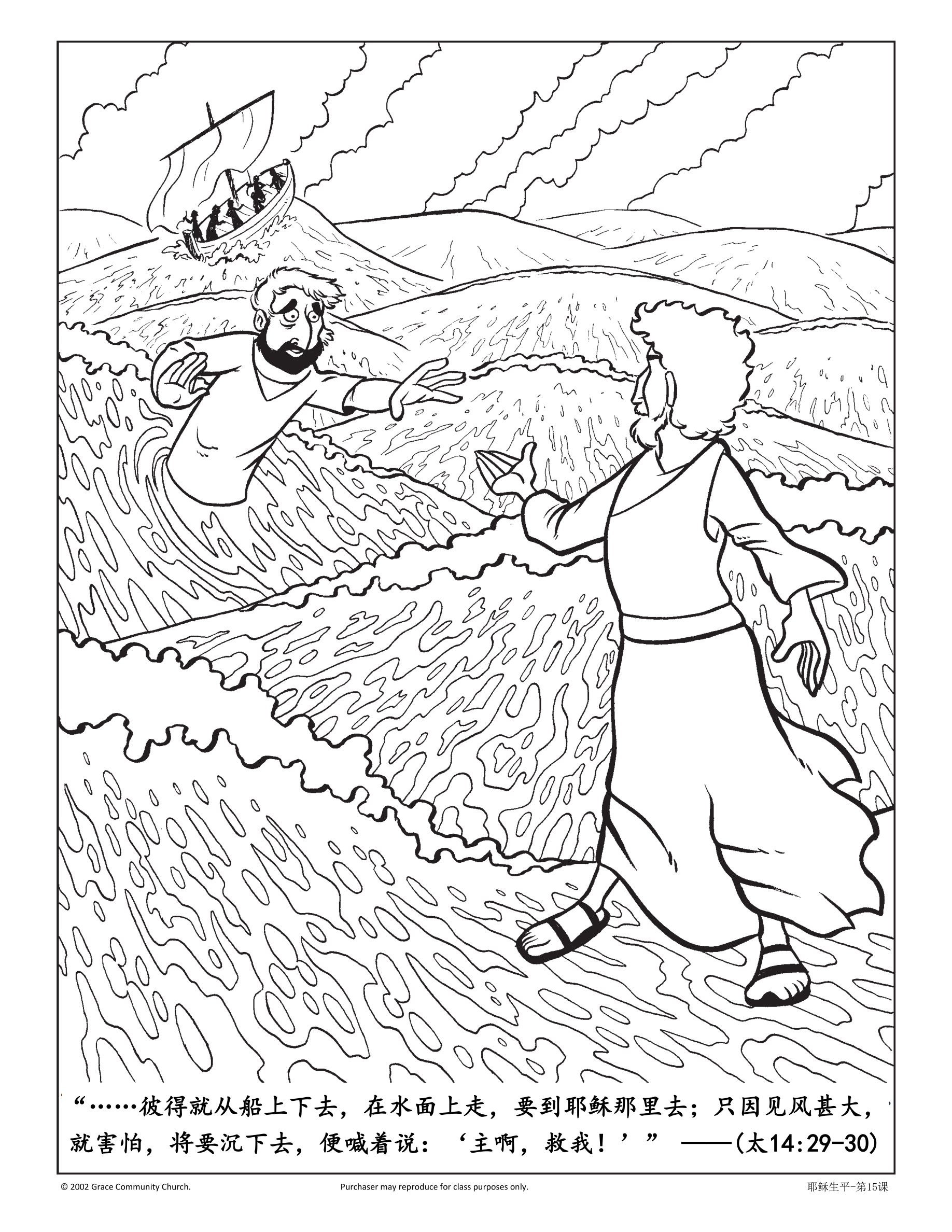 课堂说明:给孩子们底图并指导他们给图片装饰上色。他们可以将彼得的胳膊贴在上面,让它从左下角一直伸展到右上角。耶稣的胳膊可以用一个无头钉钉在右上方。最后,孩子们可以将风浪贴或者钉在手工页的下方。