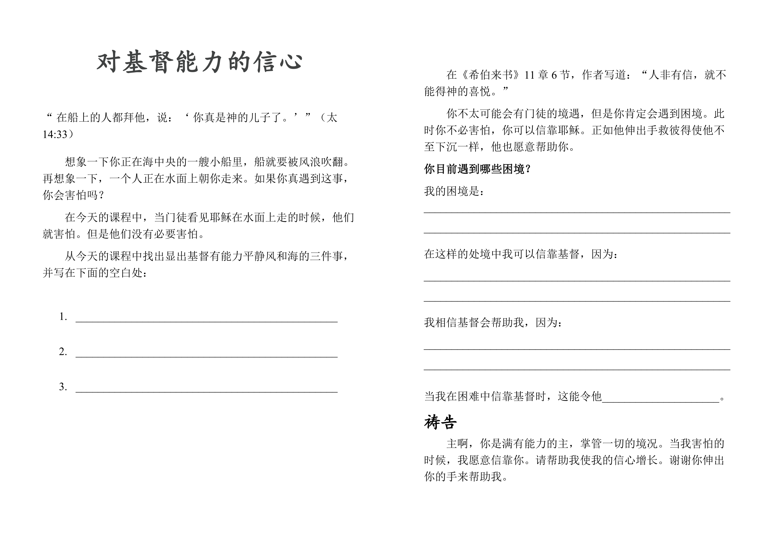 问问孩子们他们能否解释“信任”或“信心”的意思,是害怕又小心地去尝试的意思吗?早上来到教室的时候,老师会叫你坐到椅子上。此时,你会提前检查一下椅子是否完好无损吗?不会,你进来后直接坐下了。你完全相信这把椅子可以支撑住你,不会让你摔倒在地上。我们也可以对耶稣有着这样的信心,相信他可以救我们脱离罪,并带我们去天国。
