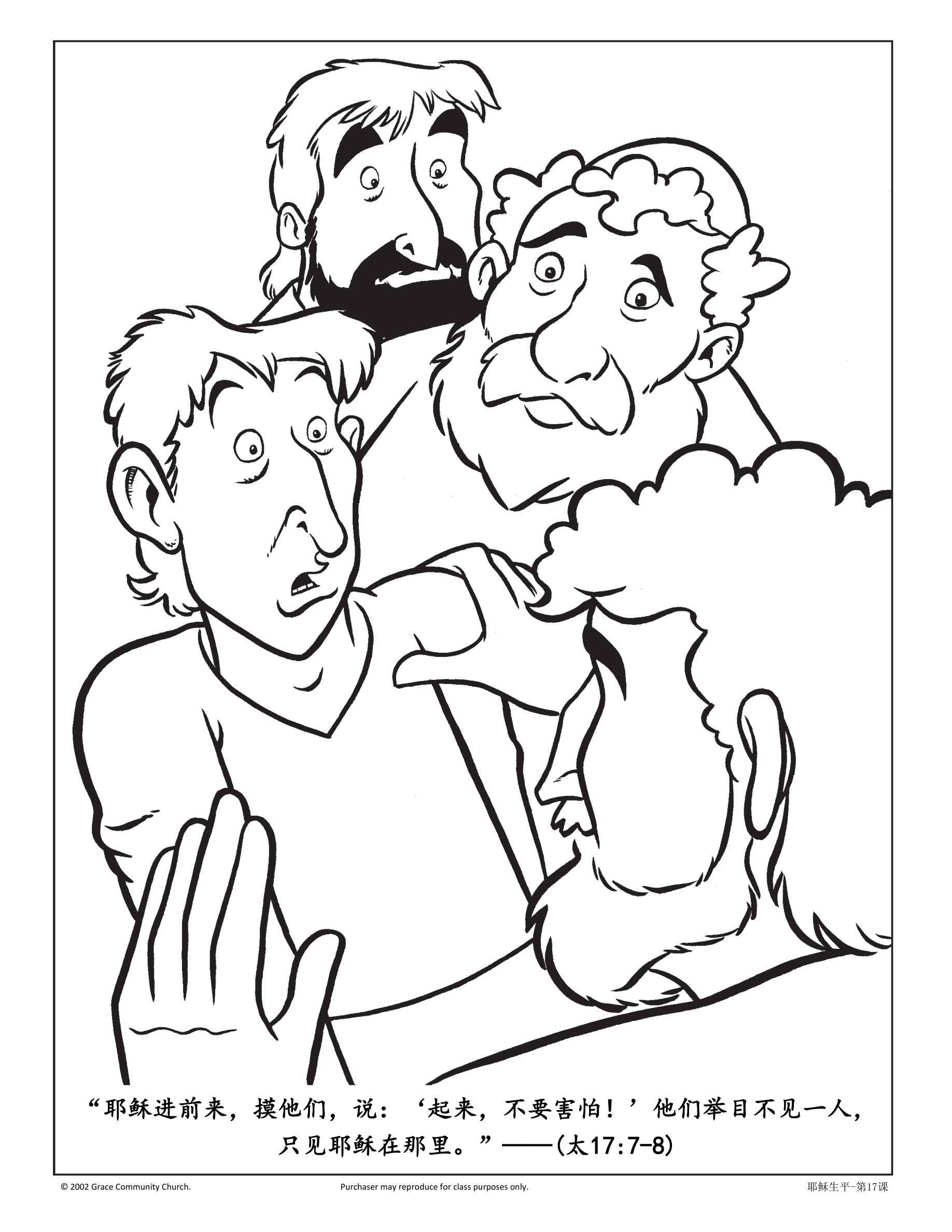 耶稣恩慈地使躲避神荣光的门徒平静下来,他“进前来,摸他们,说:‘起来,不要害怕!’”(太17:7)。门徒听从耶稣,抬头一看,只看见他(太17:8)。摩西和以利亚回到天上,神的荣光也离开了。